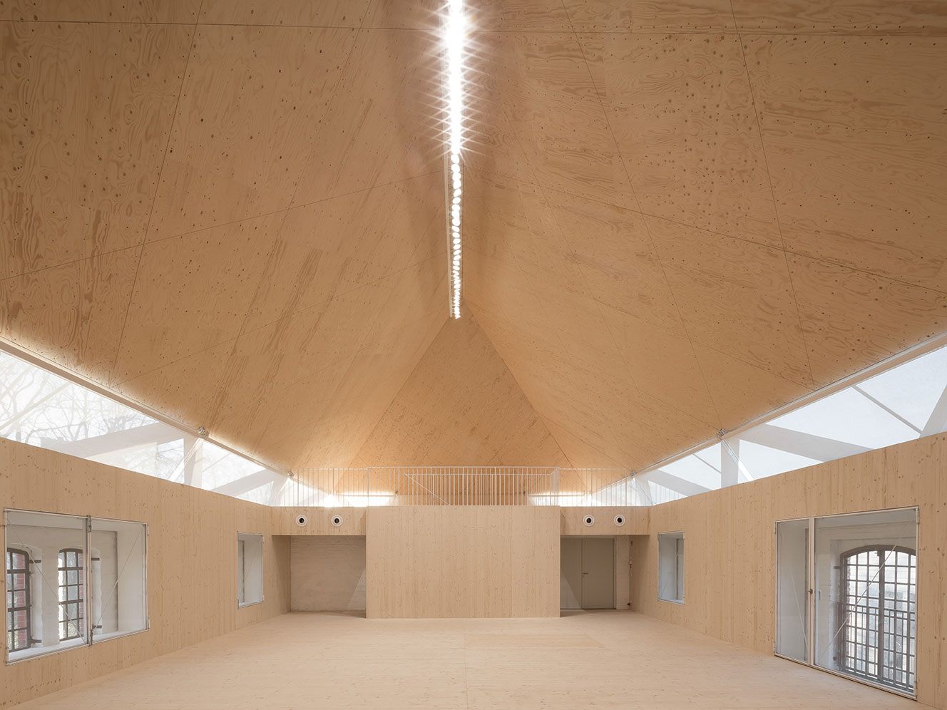 Internally, the thick brick walls have been lined with 3 metre high plywood panels in spruce. The panels, which also cover the floor, are set back from the external walls and have openings to accommodate the existing windows. One of the requirements from the University of Fine Arts was that the space should be kept free from distracting elements and technical installations, to give the space as clean and pure a feel as possible. The ventilation has therefore been concealed in the gap between the outer and inner walls.