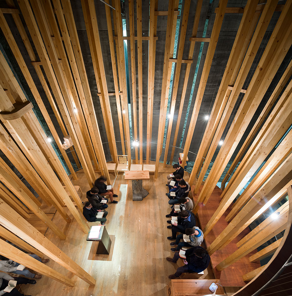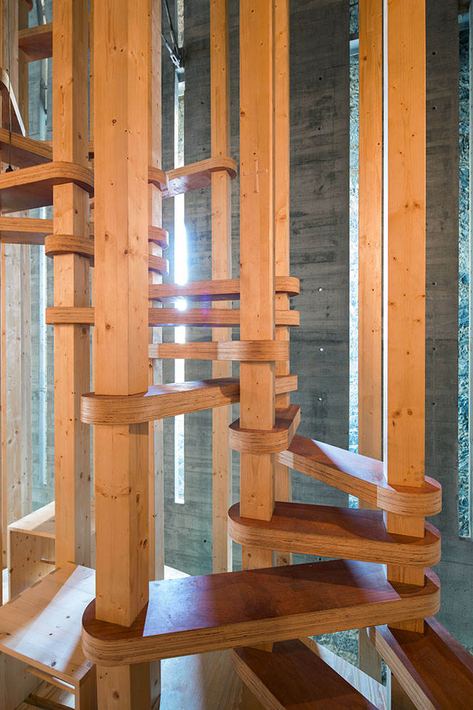 “The sense of walking between the tree trunks is to be seen as both a pleasant transition and a filter between the profane and the sacred space,” says António Jorge Fontes, who runs Cerejeira Fontes Architects together with his brother André Fontes and the sculptor Asbjörn Andresen.