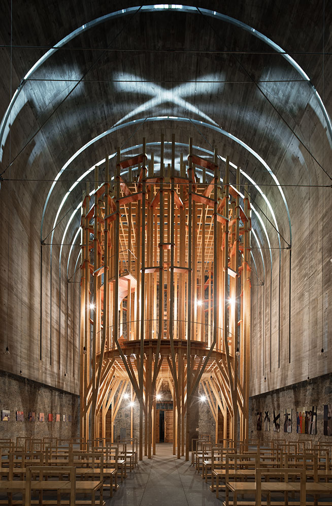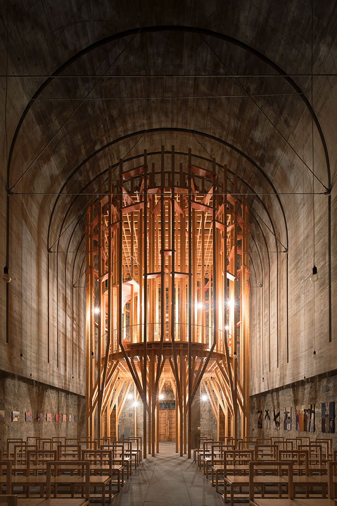 The chapel sits beneath a 12 cm thick concrete arch that defies its own materiality by appearing to float freely between the wooden structure and the stone walls of the church. The arch is held in place by a number of galvanised steel ties that stretch from wall to wall. Slits in the arch filter the sunlight and offer momentary contact with the world outside, while at the same time the enclosed feel encourages visitors to turn their gaze inwards. The lighting comprises around a hundred LED lamps that hang from the ceiling. The arch helps to give the church new and much better acoustics, an interesting and attractive light and a sense of space. The place of worship is simple and minimalistic, with restrained decoration.