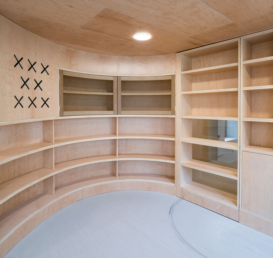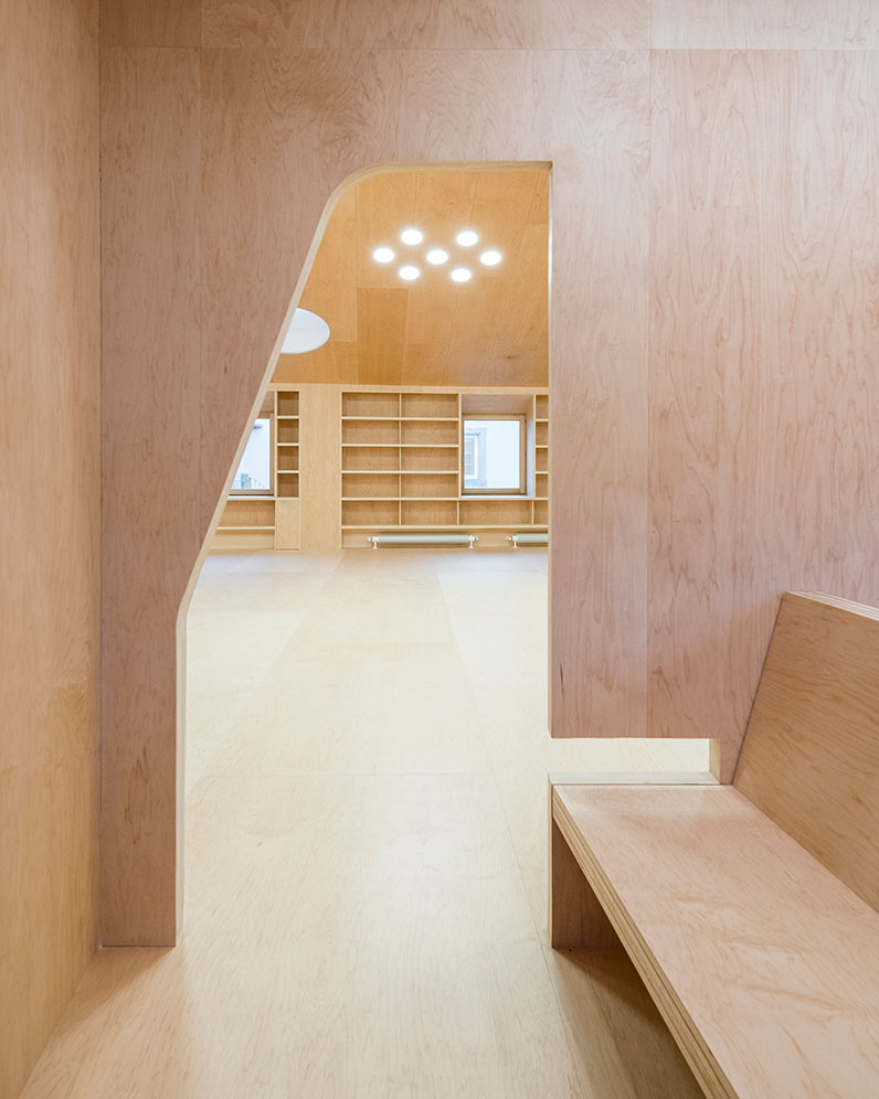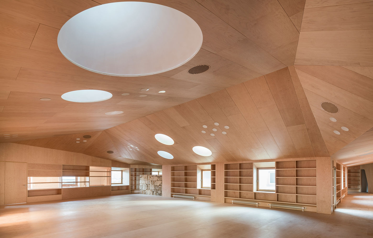 The architects wanted to explore the idea of a kind of monomateriality, which features in many of Baiona’s historical buildings, where walls, floors and even the ceiling are made of stone. They have embraced this notion for the interior of the library, where the rooms’ walls, floors and ceilings are clad in certified maple veneer, fitted to a timber frame. In contrast to most other woods, the sapwood is used for maple instead of the heartwood. This gives an almost bone-white colour, sometimes with a hint of red or warm gold.