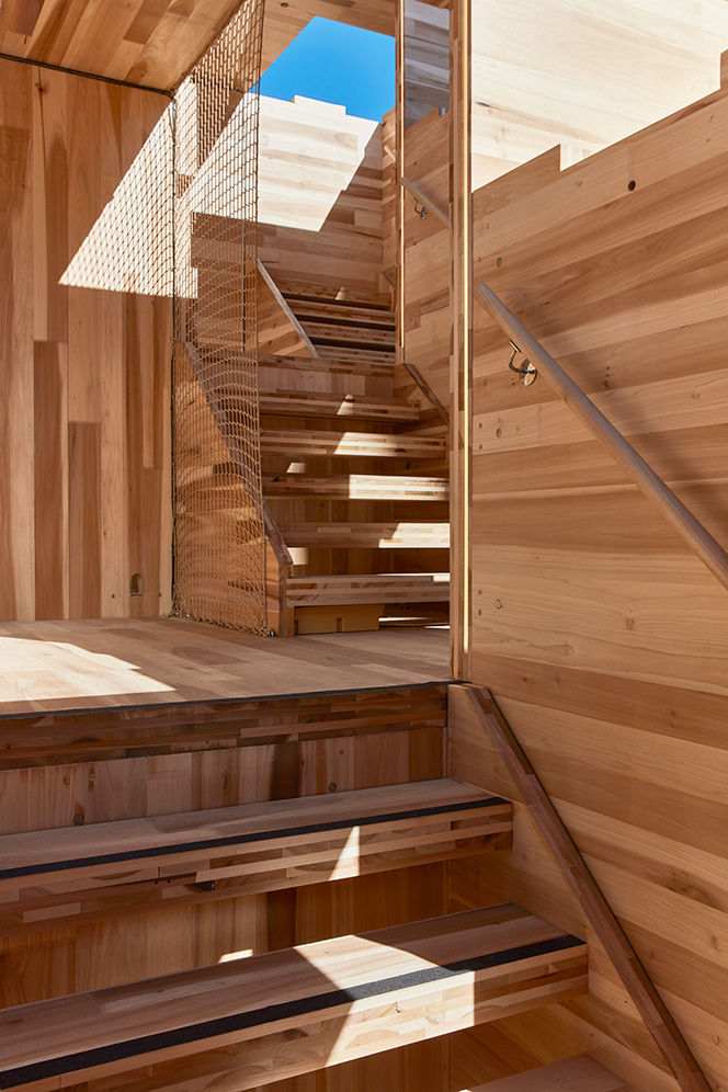 The structure comprises 17 connected modules, produced from 102 CLT panels, which were manufactured in the UK for the first time. The American tulip wood – chosen for being stronger than spruce – was, of course, imported from North America, but the CLT panels were then manufactured in a newly opened Scottish research factory. To further improve strength and stability, the wood in the upper panels has been heat-treated, which makes the material less susceptible to the weather and more water-resistant. Heat treatment is nothing new, but this is the first time it has been done on material that is then turned into cross laminated timber. The other panels are treated with a clear matt varnish.