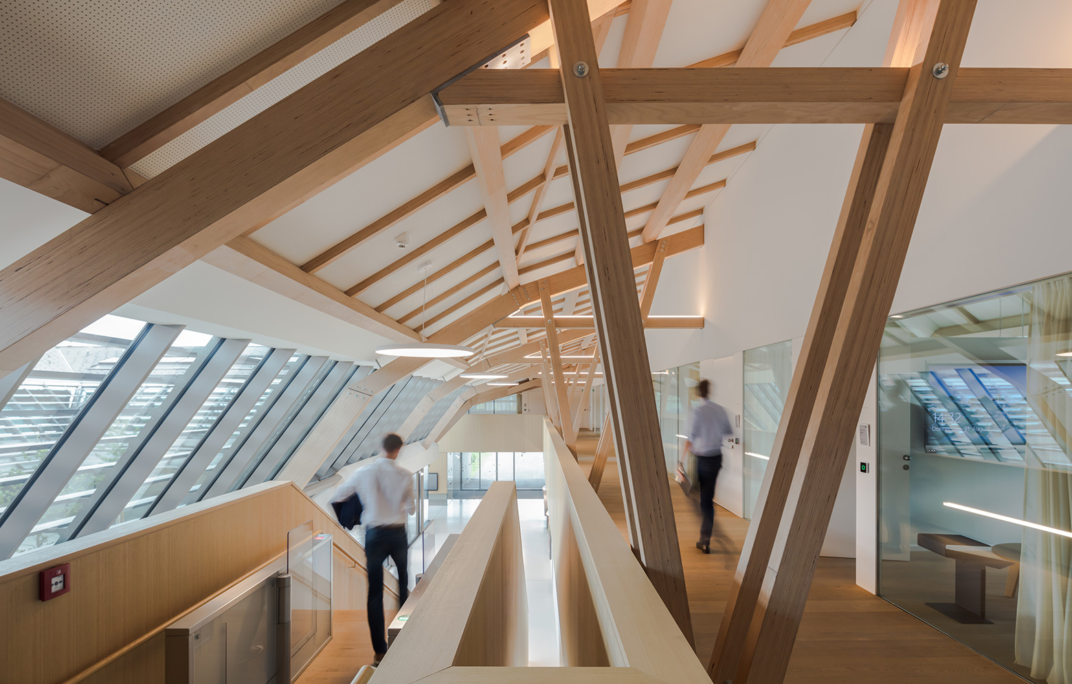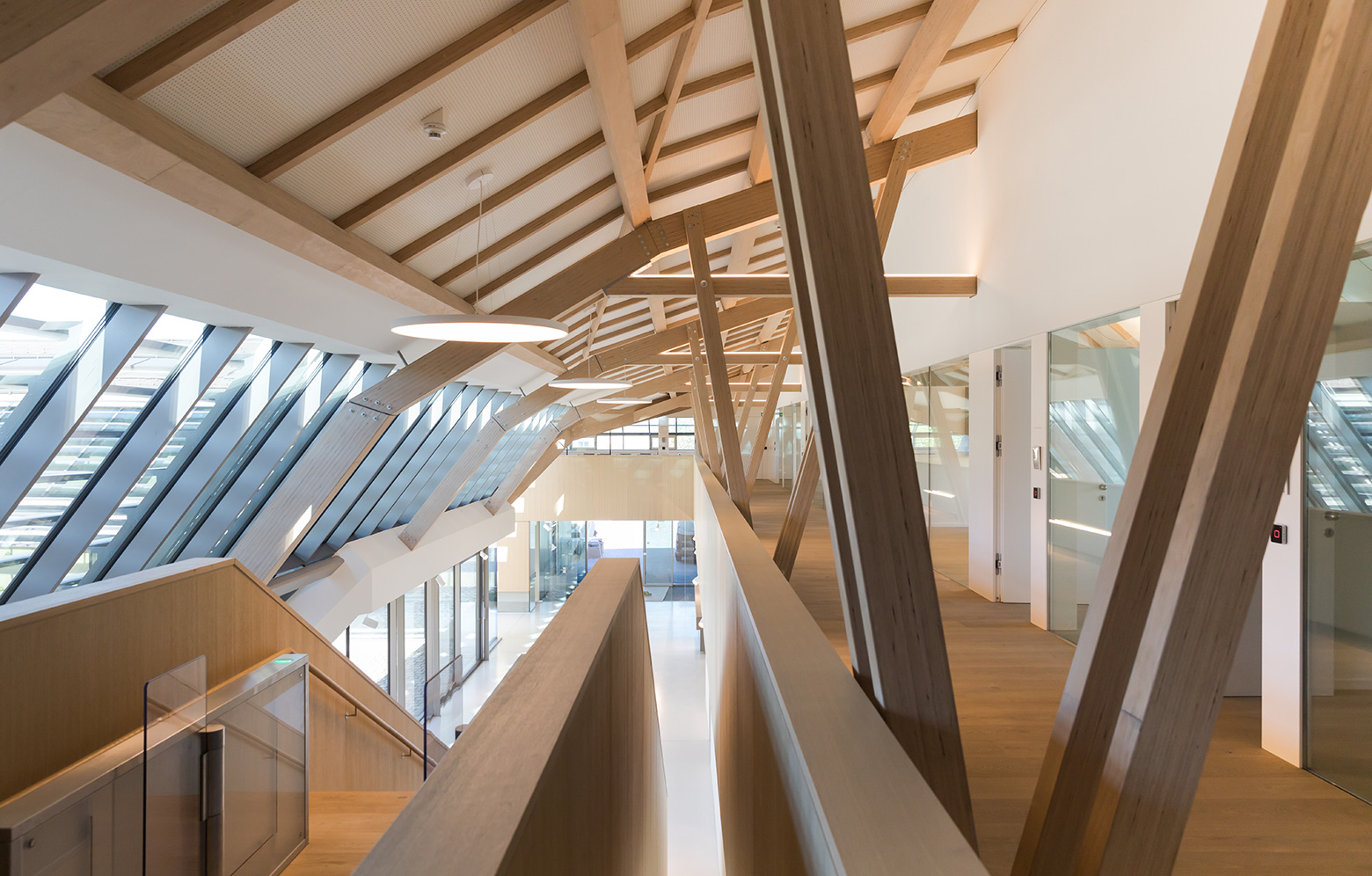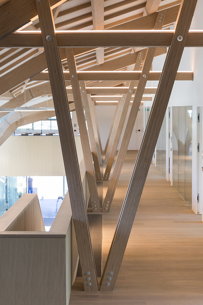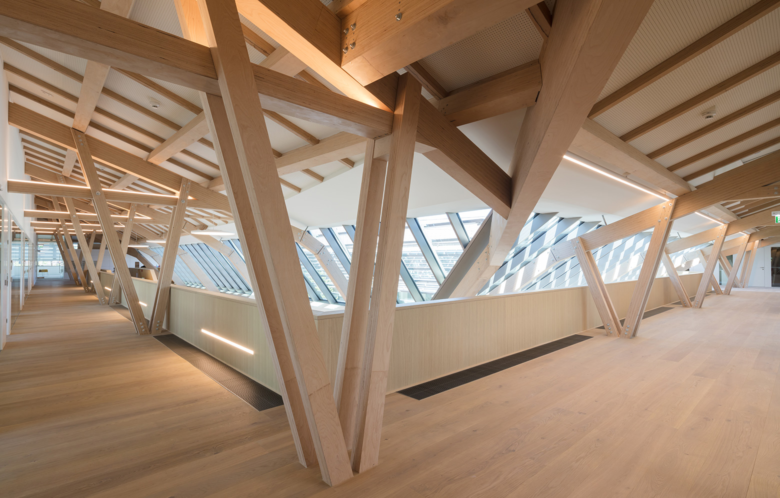 To create the complex, asymmetrical roof geometry, which comprises over 240 nodes and requires precise assembly, the architects used 3D technology to develop a model of how the components would fit together. The sections were then prefabricated using CNC technology. The structure is made from Baubuche, an LVL beam in local beech, which has been left untreated. The supporting LVL posts run up from the ground floor and have been left largely exposed to give the interiors a cohesive look.