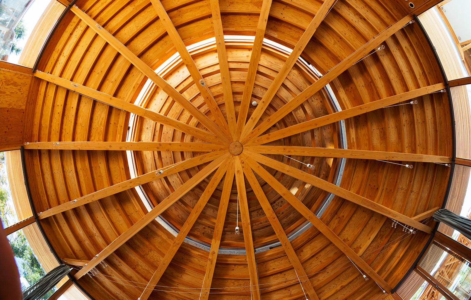 The volumes are all made of wood, which is exposed in the parasol-like ceilings to show how the glulam beams hold up the structure by meeting in the middle, like the petals of a flower. Last year the design won the prize for best school building at the World Architecture Festival.