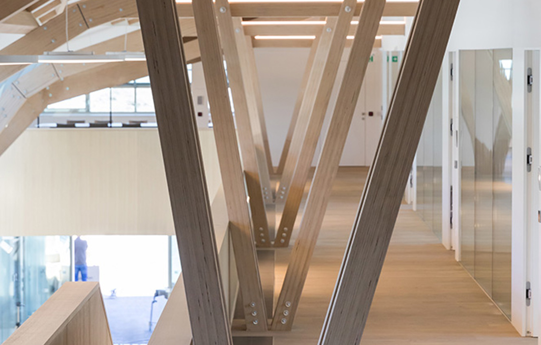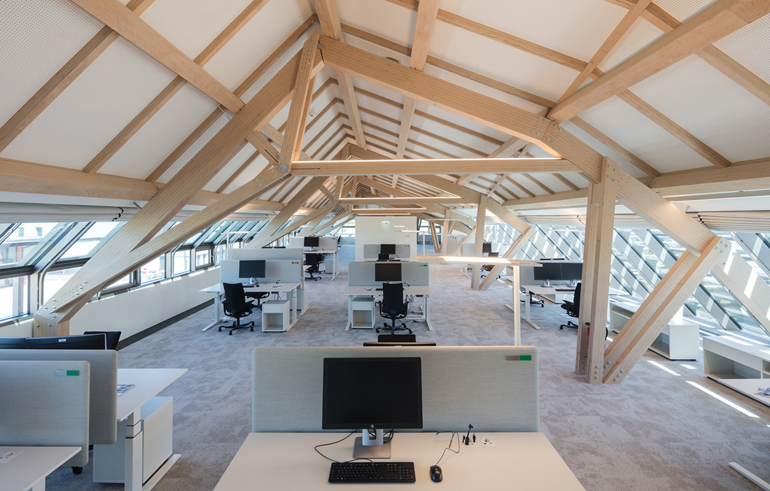 To create the complex, asymmetrical roof geometry, which comprises over 240 nodes and requires precise assembly, the architects used 3D technology to develop a model of how the components would fit together. The sections were then prefabricated using CNC technology. The structure is made from Baubuche, an LVL beam in local beech, which has been left untreated. The supporting LVL posts run up from the ground floor and have been left largely exposed to give the interiors a cohesive look.