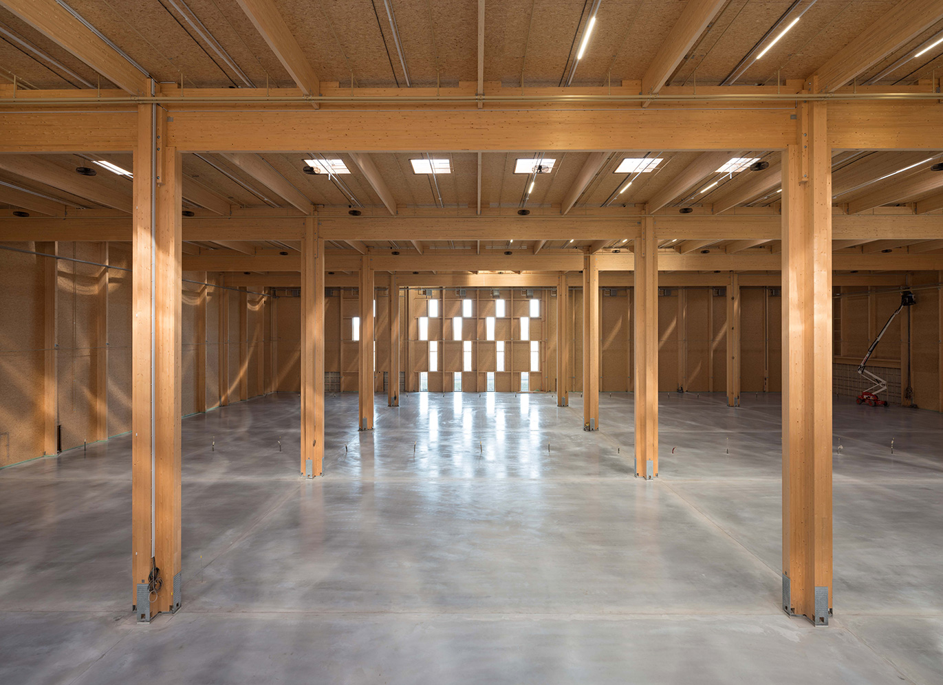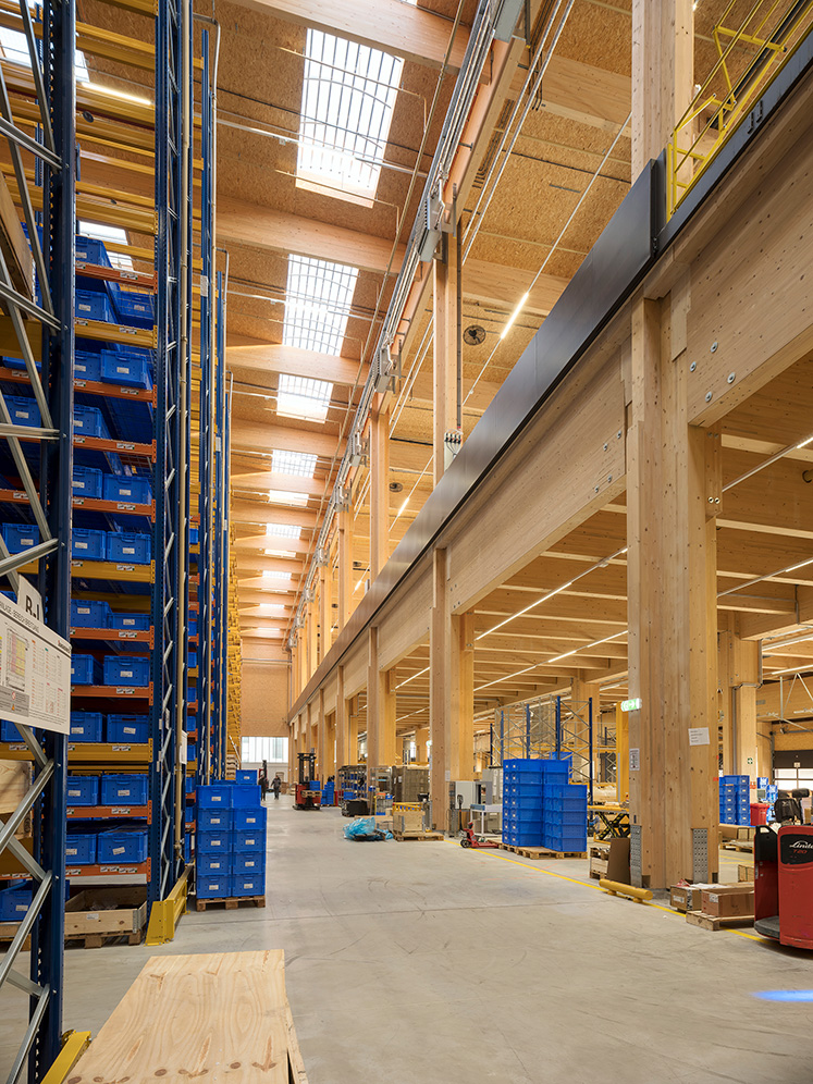 The building is fitted with 20 loading bays for incoming and outgoing goods. To protect the posts from stray forklifts, flexible bumpers have been embedded in the floor slab, And in the event of a fire, the wooden structure is designed to remain structurally sound for 60 minutes. A sprinkler system has also been installed throughout the building.