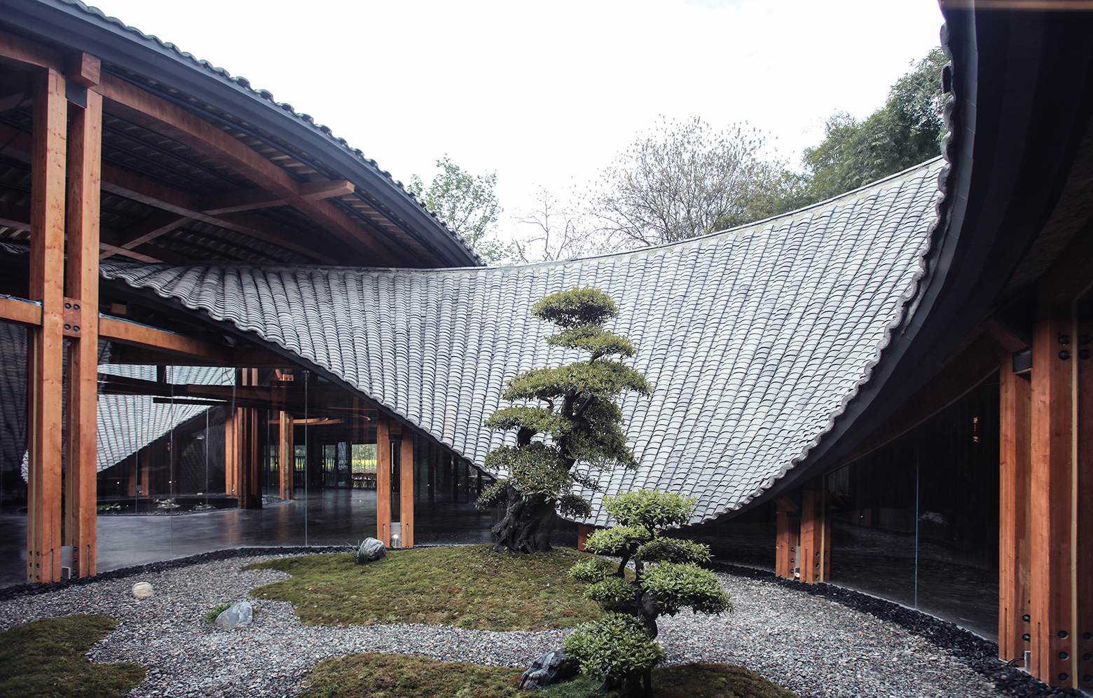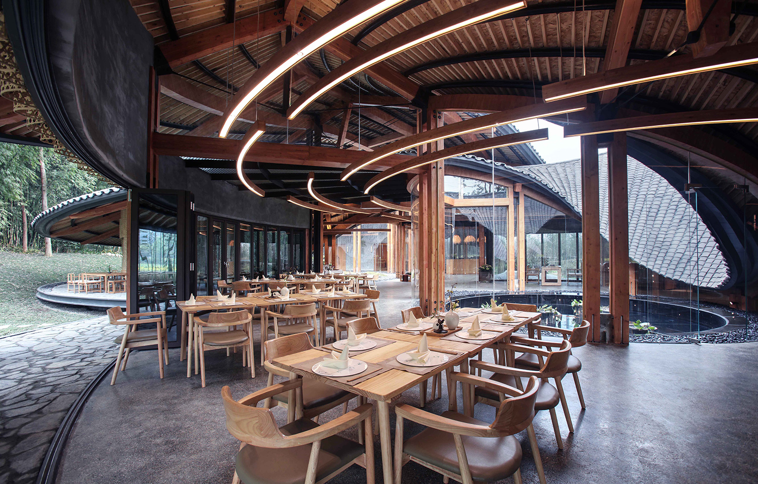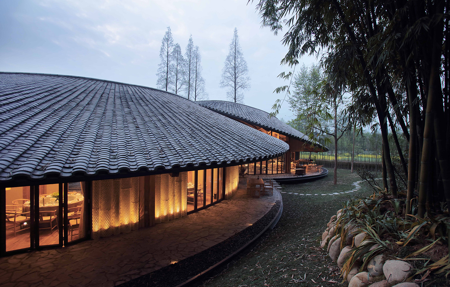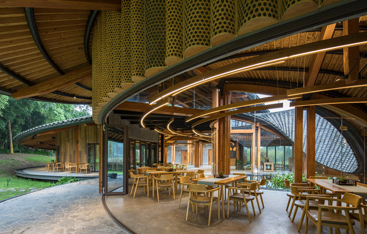 Naturally, bamboo played a major part in the design, and not just via the façade patterns created by a local artist. With its airy design and integral garden, the building also makes visitors feel like they are in a bamboo forest. The architects soon worked out, however, that bamboo was not going to work as a load-bearing material. Instead they chose to work with glulam posts and beams to support perhaps the building’s most eye-catching feature – the roof, shaped like an infinity symbol, joins the two circular buildings into a single entity. The roof’s grey ceramic tiles, which are common in the local vernacular, hide a steel frame that creates the gentle curves. On top of this rest secondary glulam beams that have been left exposed to accentuate their look.