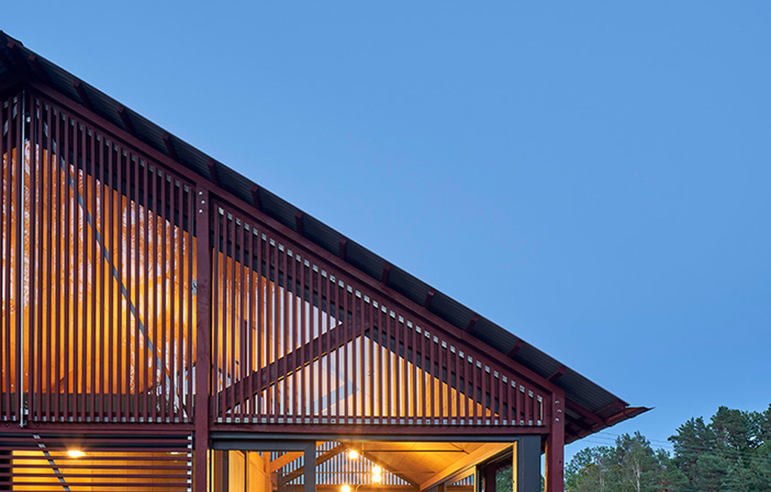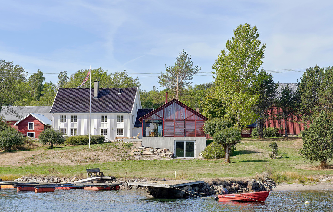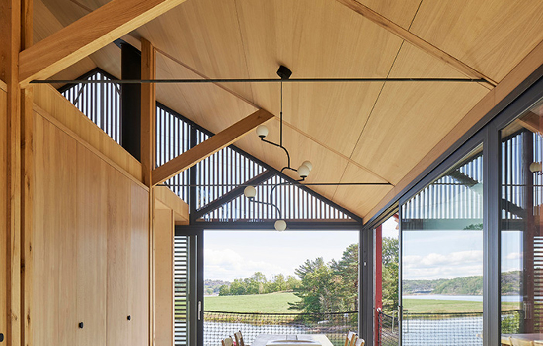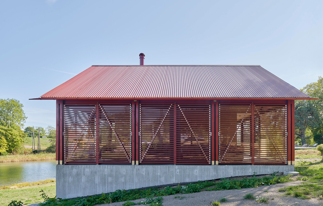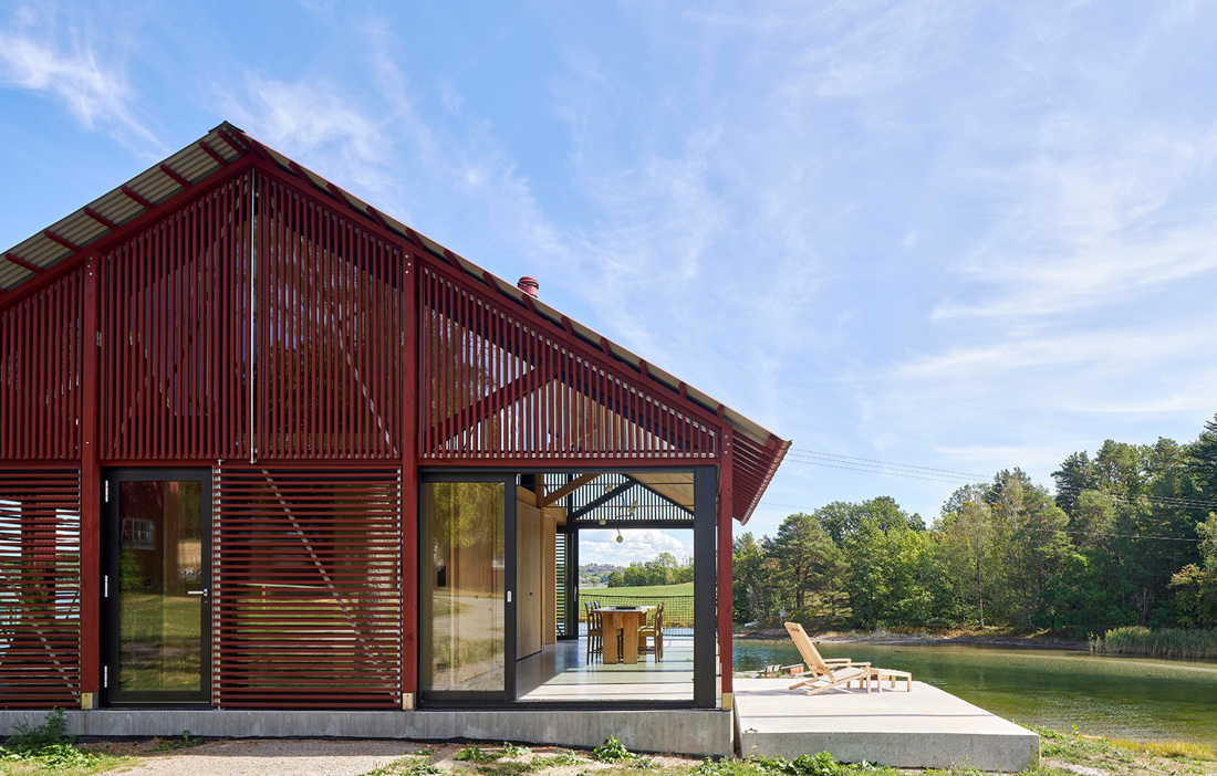 The building is enclosed by large expanses of glass that are supported externally by oak posts and covered with a wooden screen, all stained red. The screens and windows can easily be opened and slid to the side, so on hot summer days the house can be transformed into an open pavilion and then closed up when the family wants to withdraw from the outside into the warm embrace of the home.