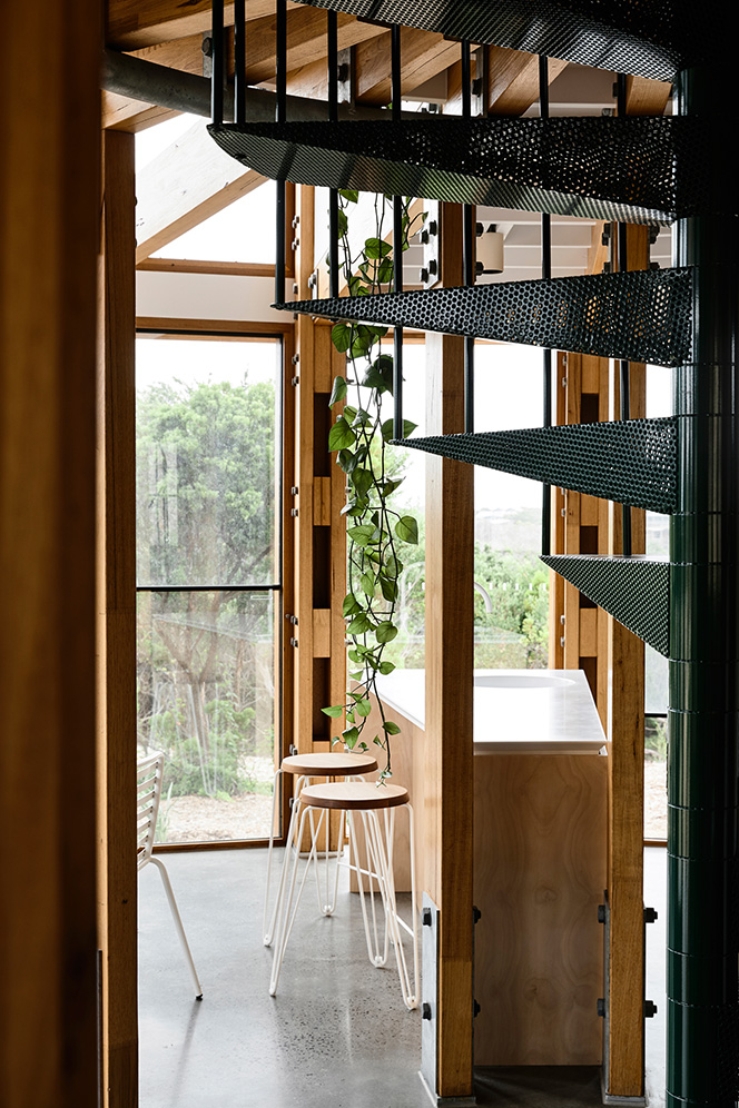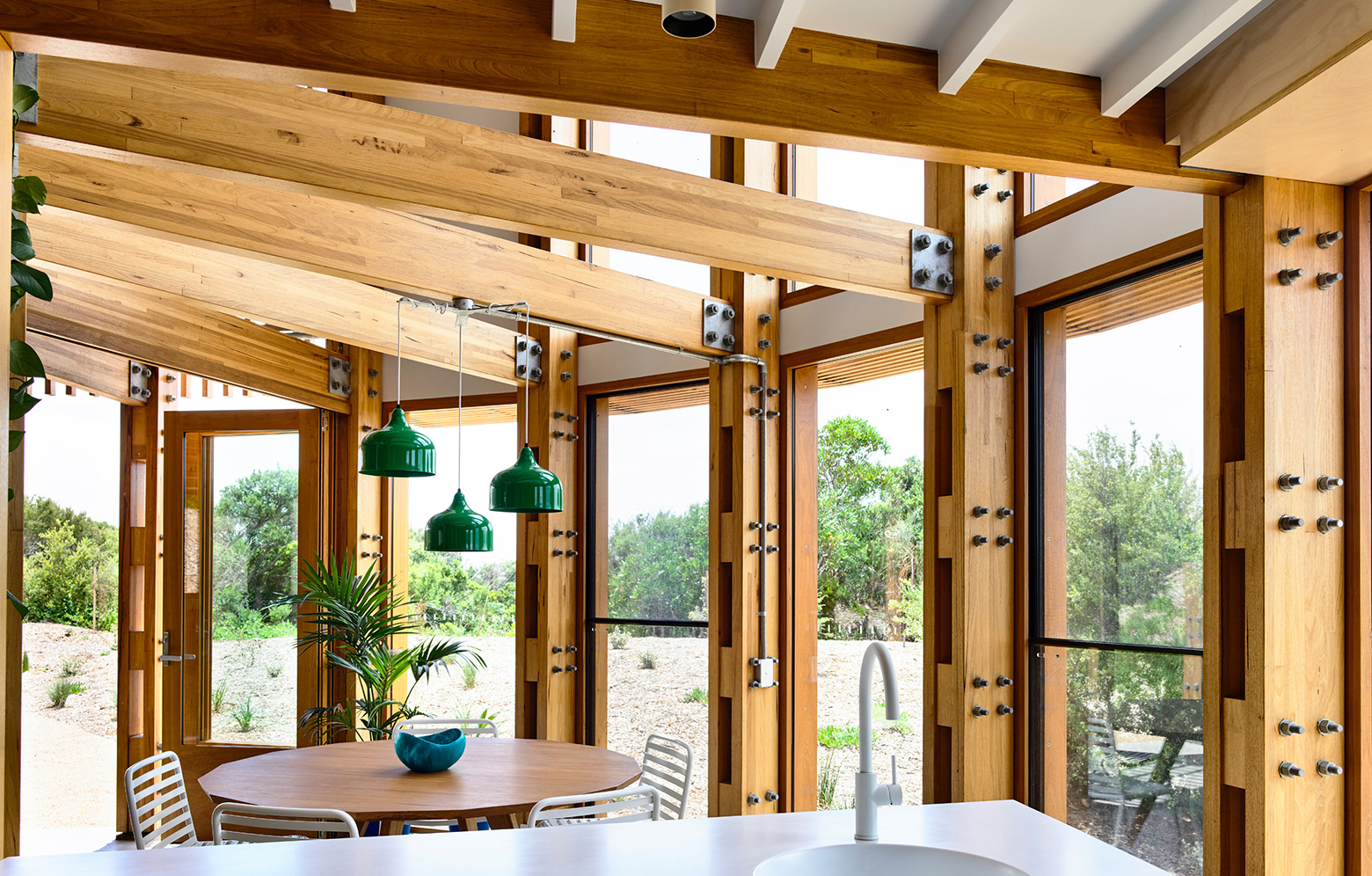 The house has been built with sustainability in mind. The façade is clad in a eucalyptus named silvertop ash, while the post and beam structure in the same wood has a robust feel that is accentuated by the clearly visible screws and bolts.