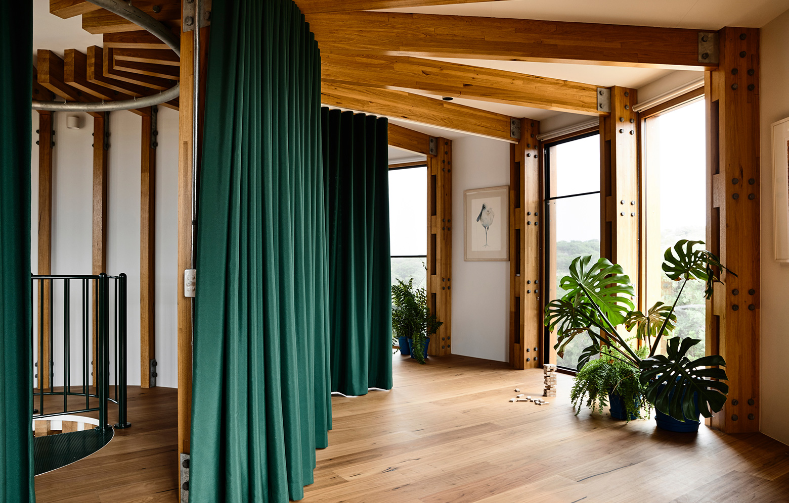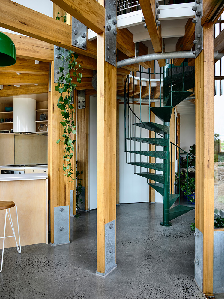 While holiday homes are generally getting bigger and being built for permanent use, the owner of the plot on St Andrews Beach, south of Melbourne, just wanted a simple bolthole. With an image of the rickety huts created from remnants of wood and flotsam that are often seen on New Zealand’s beaches in their minds, the architects were inspired to create a building that looks more like a tent than a house and only contains the bare essentials. Superfluous additions such as a hall and internal walls were stripped out, leading to a cylindrical building with two floors and a diameter of less than 10 metres. The bedroom on the upper floor is screened off with a curtain, and the shell of the building is the only limit on how one can use the space.