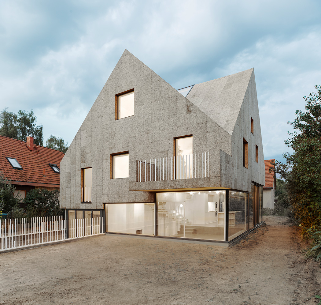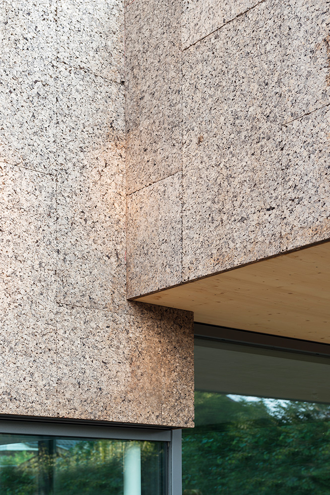 It began with a strong wish for the new home to have the best possible acoustics. Rundzwei Architekten found a material – cork – that not only worked to improve the sound and insulation, but was also the key to the German villa’s distinctive look. The material that is used in wine bottles and for table mats is taken from the bark of the cork oak. The granules that are a by-product of production can be used for other things, such as building façades and roofs. When the granules are heated and pressed into panels for façades and so on, this releases a resin that binds the grains together. The result is a light and sustainable construction material. Internally there are generous expanses of pale wood, all revolving around the spiral staircase that leads the visitor through the levels of the house. The wood is complemented by plasterboard to create a pleasant indoor climate with just the right humidity. Combined with cork, wood fibre and cellulose insulation, this means that the house needs no ventilation system.