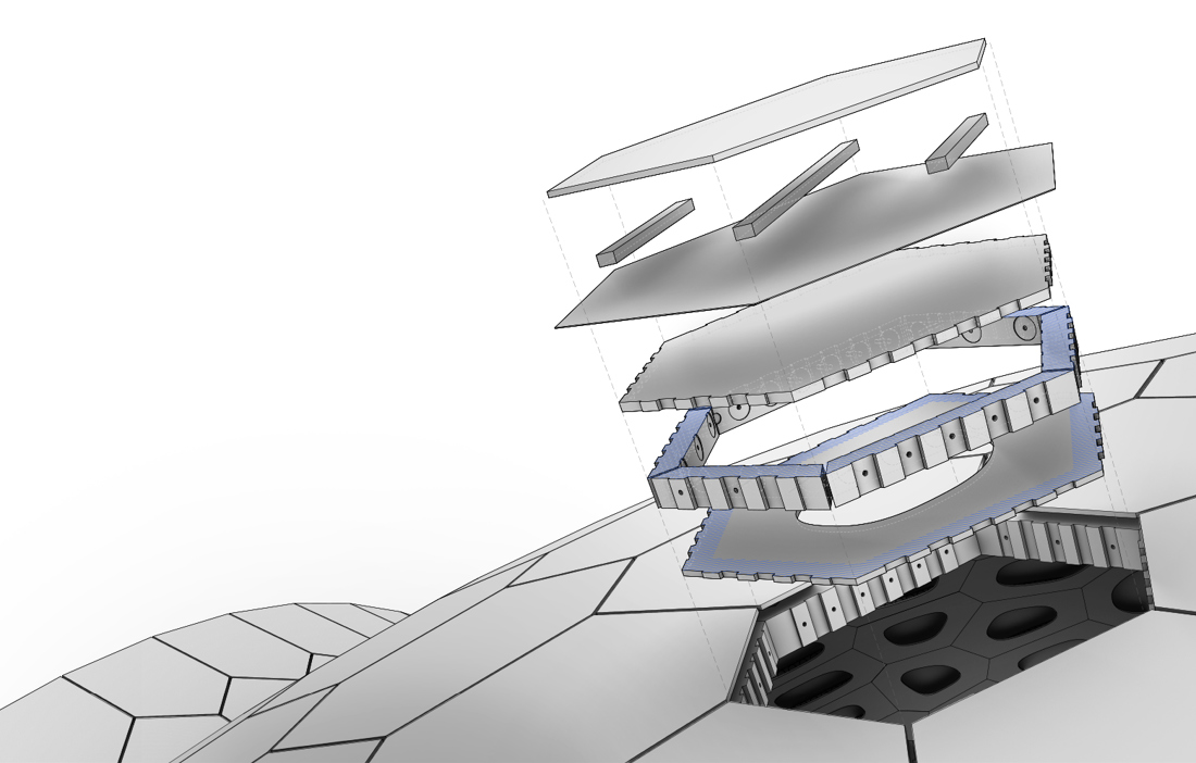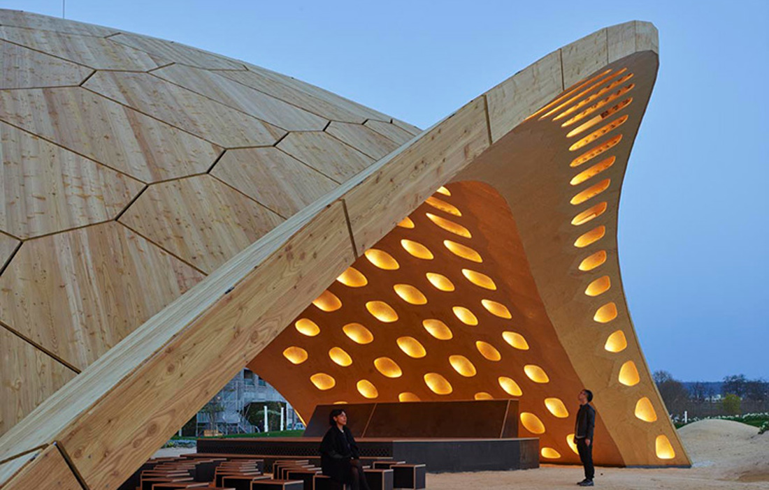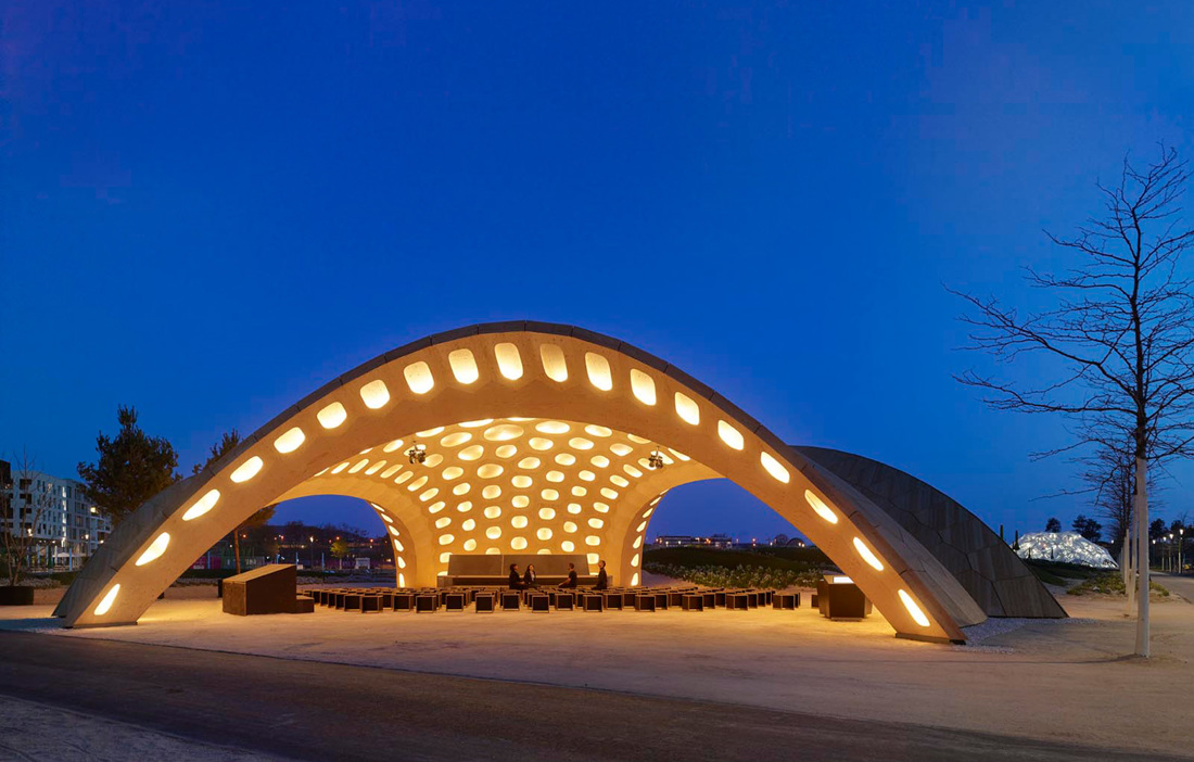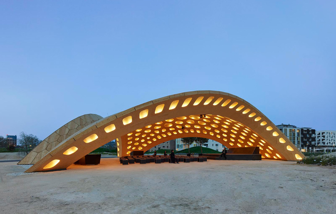The pavilion measures 32 x 25 metres and comprises 376 polygonal wood panels. The structural engineers studied the skeleton of sea urchins and then applied the same principle to develop the advanced structure. Each segment is made up of six layers: the base plate is followed by a layer of glulam joists, and on top of that is a panel, all made of spruce. Topping this structure is a waterproof membrane, followed by mouldings that help rainwater to run off, and finally there is a layer of façade cladding in larch plywood.