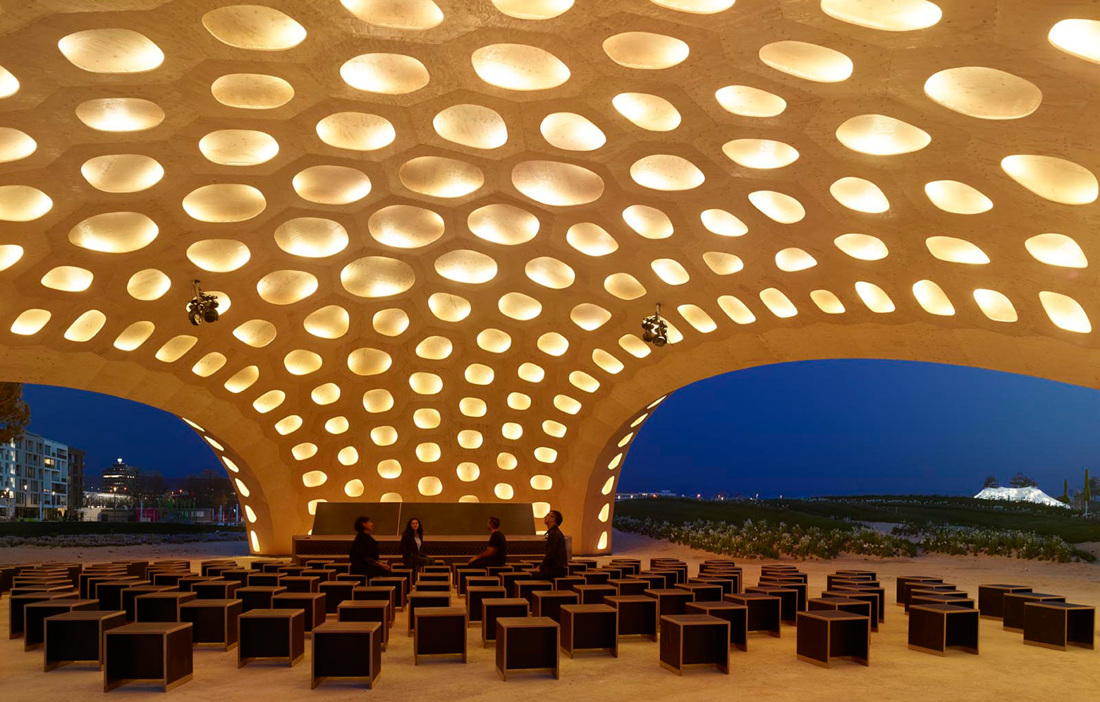 In addition to this pavilion, the University of Stuttgart is also contributing a pavilion made from glass fibre and carbon fibre elements.