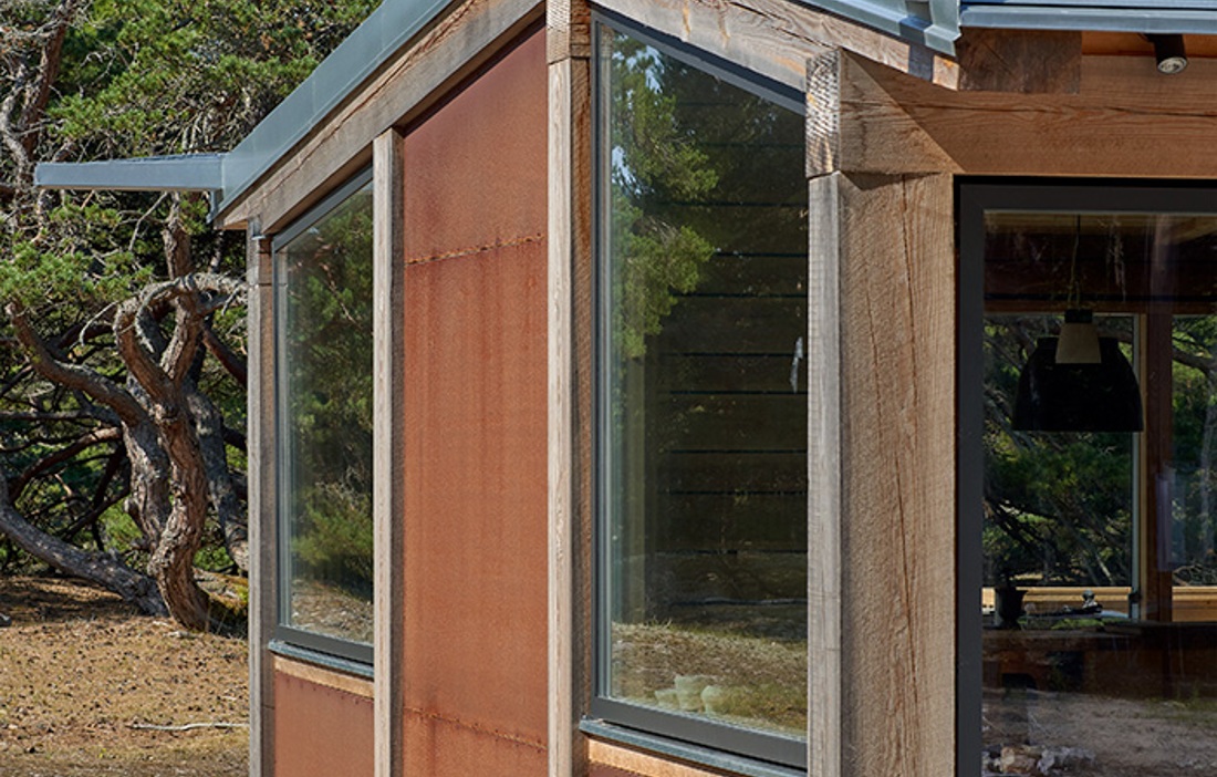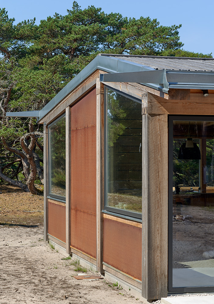 Sjaustru is a sensitive site, and the design of the new building required a dialogue with the County Administrative Board. A glazed veranda, flanked by the façades to protect against the often strong winds, was fine, but the building had to not dominate the landscape. A natural colour palette was therefore chosen, with the exterior comprising harmonised pine and corten steel, plus the glazing.
