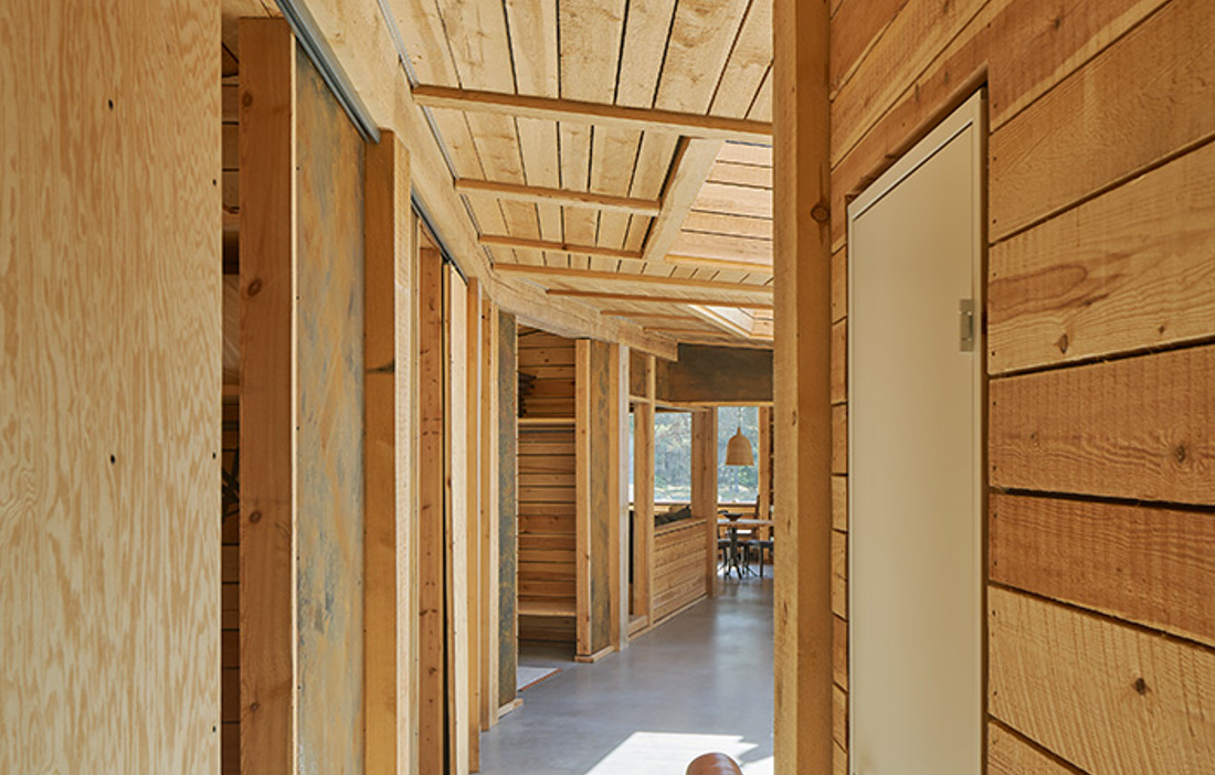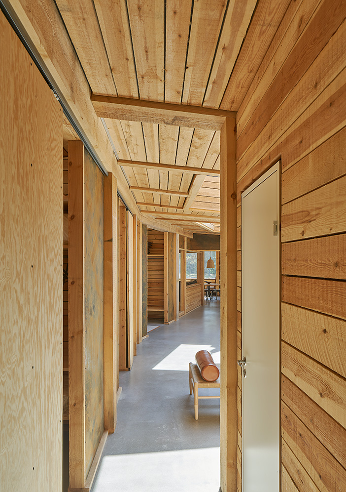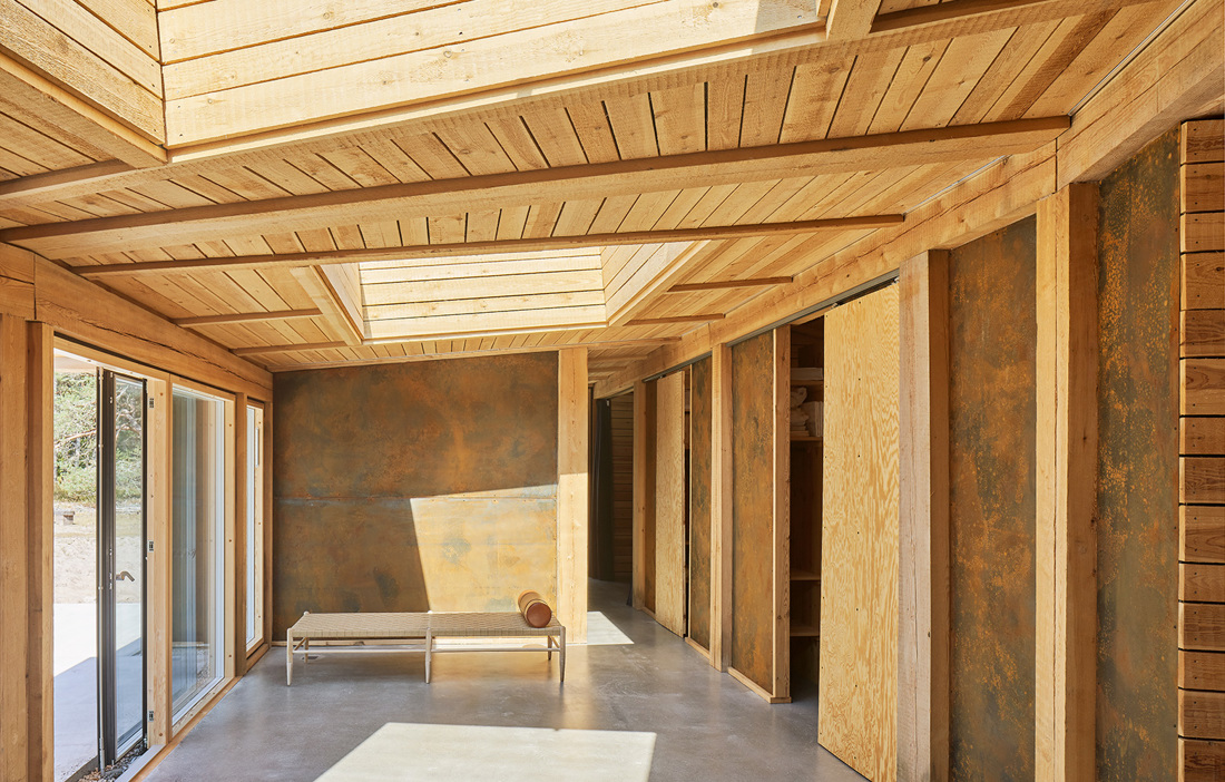 Internally, the load-bearing structure has been left exposed, and since the family knew that they didn’t want to incorporate any vapour barriers, the building is insulated with flax, which is able to buffer moisture. They considered treating the façade’s pine with iron sulphate, but this is not a project where anyone is in a hurry, so it gets to remain untreated for a while yet, to see what happens. Pine and corten steel are also a bold presence internally. The pine cladding has a coarsely sawn surface and is nailed in place with clear gaps.