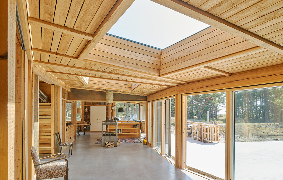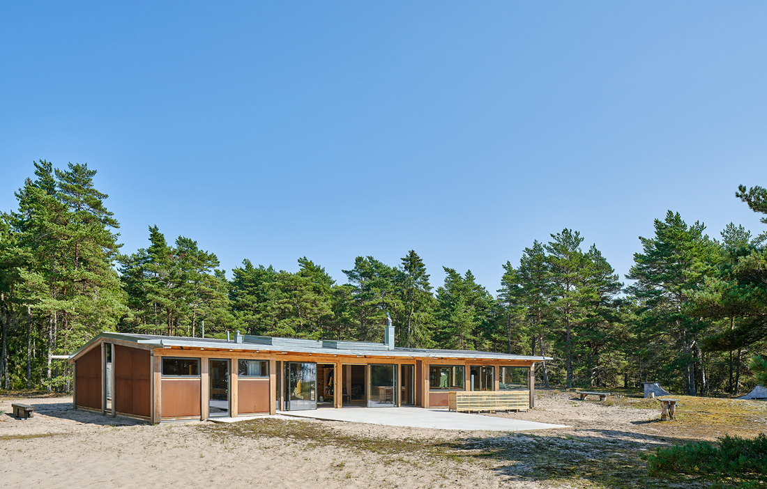 The classic Gotland bulhus is often compared with other post-and-plank designs, but here they use no diagonal stays, instead basing the house around a frame of hefty logs. In a traditional bulhus notches are cut out of the timbers to join them together, reducing the need for metal fixings. But in this modern variant, the structural engineers have used screws.