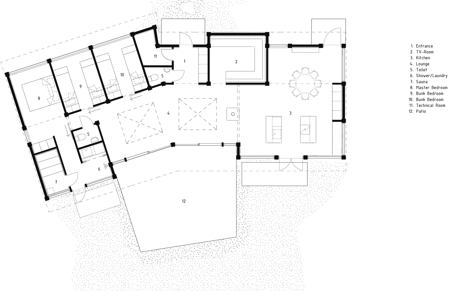 “It’s great to have a bold client who is keen to push the boundaries, without being irresponsible. We’ve been able to try several solutions involving different combinations of materials. Based on the program sketch, we drew a cross-section of the house in our conference room on a scale of 1:1, and the design grew out of that over a few weeks. We then created a 3D model, and as the potential began to emerge, we thought it could be cool to build the structural frame from real logs, a modern take on the island’s homes known as ‘bulhus’,” relates Hans Murman.