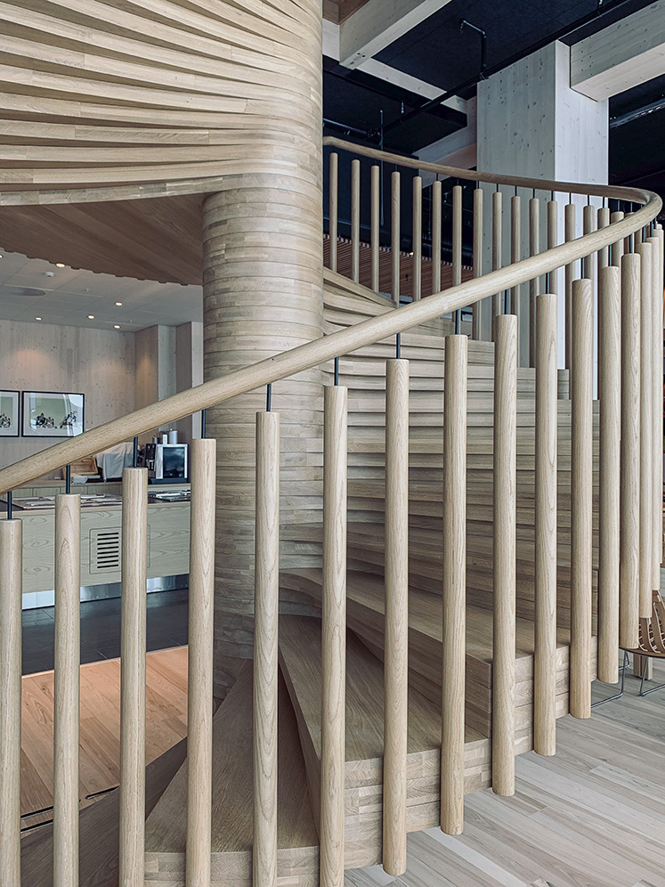 “This means that the building is heavier towards the top, which is necessary to reduce its movement in strong winds, for the comfort of residents,” explains Rune Abrahamsen, CEO of Moelven Limtre, which supplied and installed glulam beams and structural elements for Mjøstårnet.