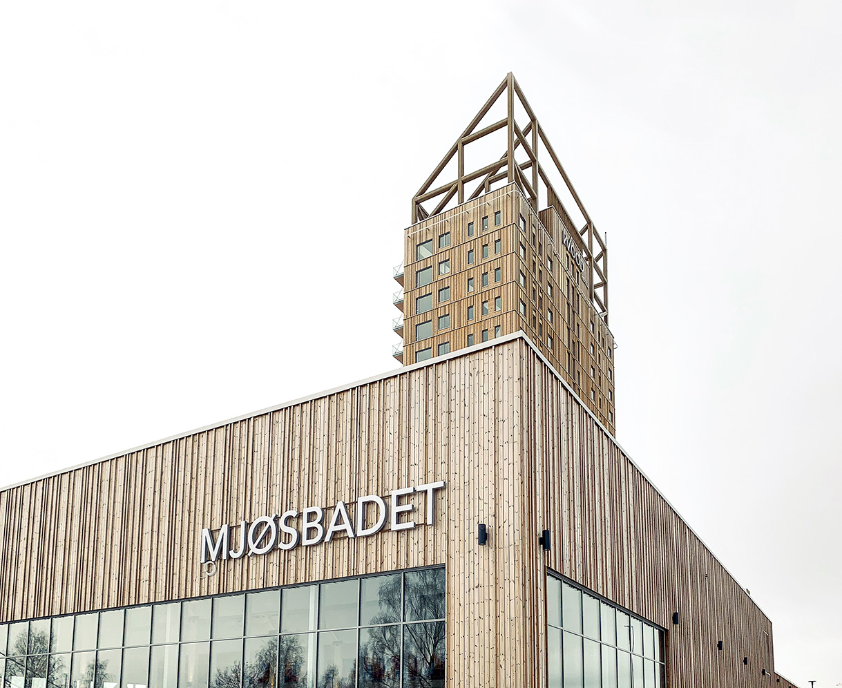 The 18 storeys create an elegant and varied landmark, with the floors split between offices on levels 3 to 7, a hotel with 72 rooms across levels 8, 9, 10 and 11, plus apartments on levels 12 to 16. Level 17 houses conference facilities with capacity for 150 people and a further two apartments. The project also includes a public aquatic centre with two 25-metre swimming pools. The total floorspace is around 16,500 square metres. Right at the top, Mjøstårnet is crowned by an airy wooden pergola that is anchored into the concrete floor of level 18. The beams in the pergola are designed to minimise air resistance. The building thus has a distinctive roofline that harmonises with its surroundings, offering a space to enjoy stunning views of town and country.
