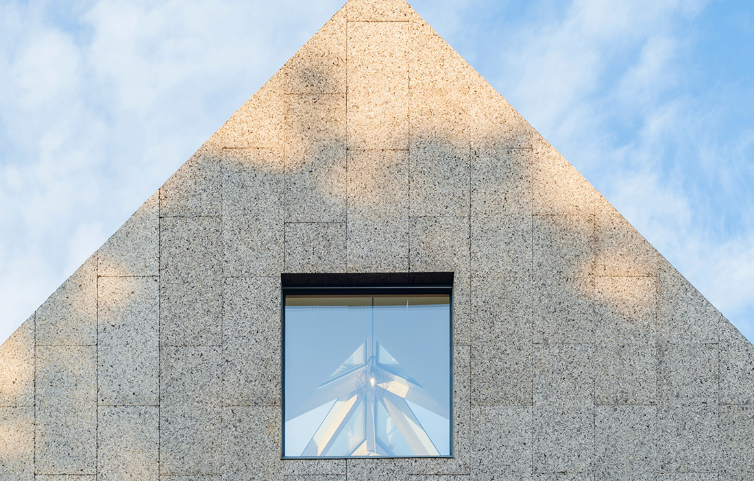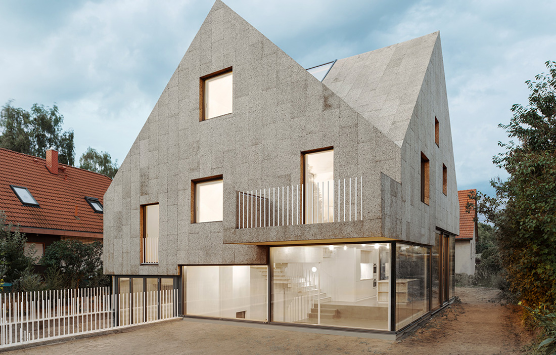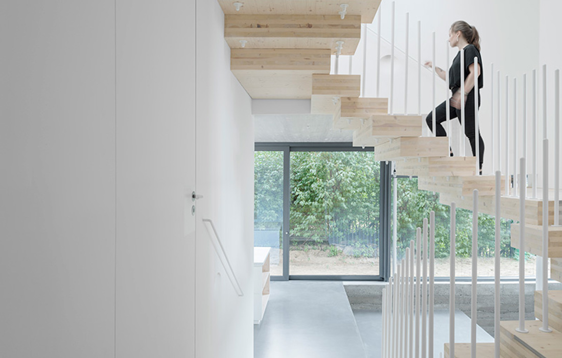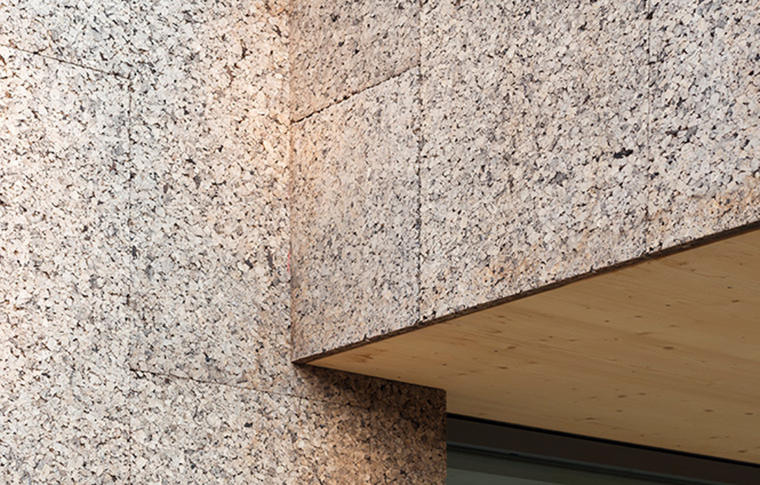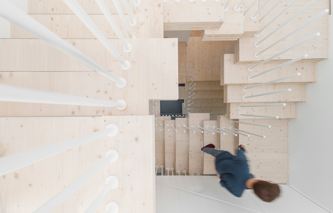 It began with a strong wish for the new home to have the best possible acoustics. Rundzwei Architekten found a material – cork – that not only worked to improve the sound and insulation, but was also the key to the German villa’s distinctive look. The material that is used in wine bottles and for table mats is taken from the bark of the cork oak. The granules that are a by-product of production can be used for other things, such as building façades and roofs. When the granules are heated and pressed into panels for façades and so on, this releases a resin that binds the grains together. The result is a light and sustainable construction material. Internally there are generous expanses of pale wood, all revolving around the spiral staircase that leads the visitor through the levels of the house. The wood is complemented by plasterboard to create a pleasant indoor climate with just the right humidity. Combined with cork, wood fibre and cellulose insulation, this means that the house needs no ventilation system.