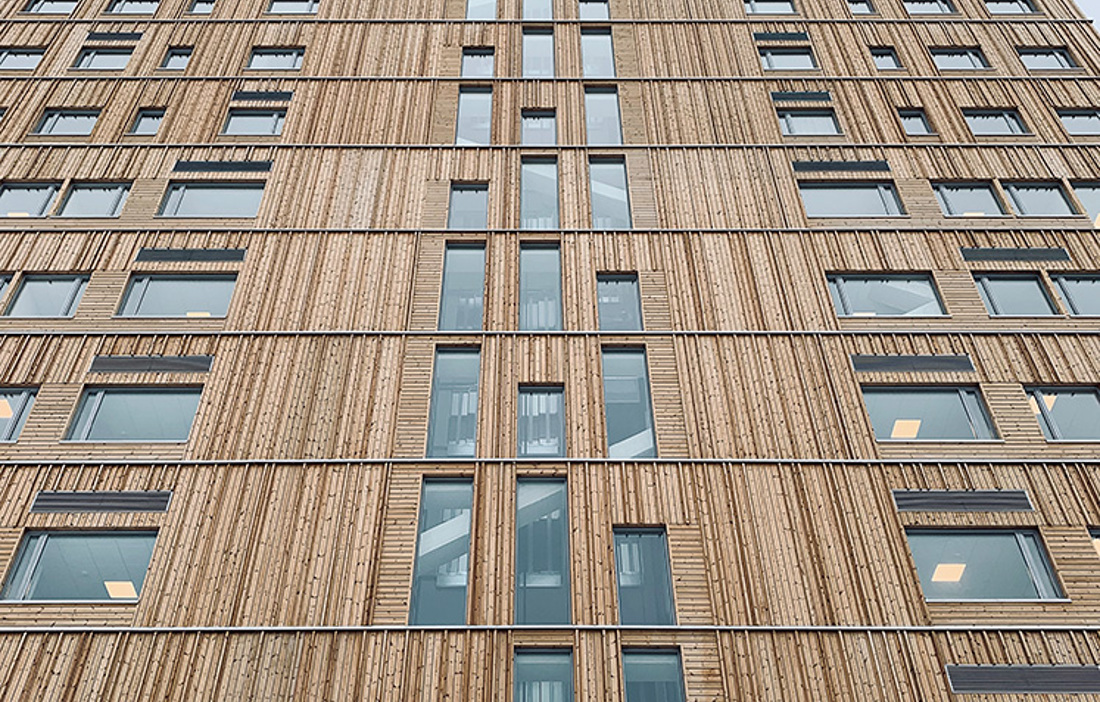 All the timber in the external walls is also impregnated with a fireproofing treatment. In addition, acid-proof fittings have been used between the floors to prevent lines of rust on the façade. At the same time, this provides extra protection against the unlikely event of a fire in the external wall structure.