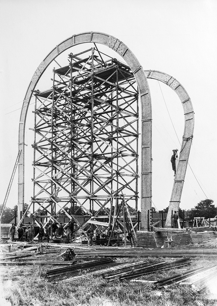 Engineer David Tenning, who worked at AB Träkonstruktioner, played a key role in the development of glulam and became CEO of the newly formed company. Many spectacular buildings came about under his leadership, including the SALK-hallen sports hall in Alvik. Opened in 1937, it had eight glulam arches with a span of 47 metres. An aircraft hangar built at Västmanland Air Force Wing outside Västerås in 1937 had 10 glulam beams and a 55 metre span – the largest in the world at the time.