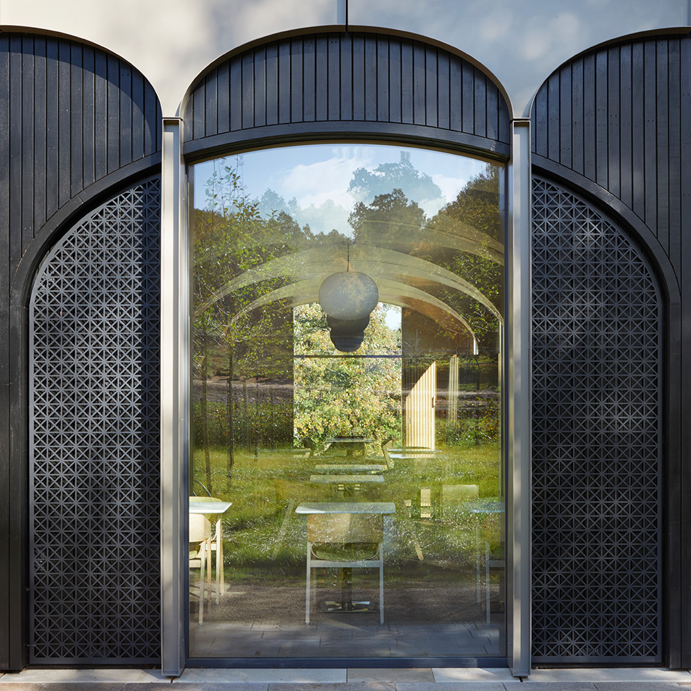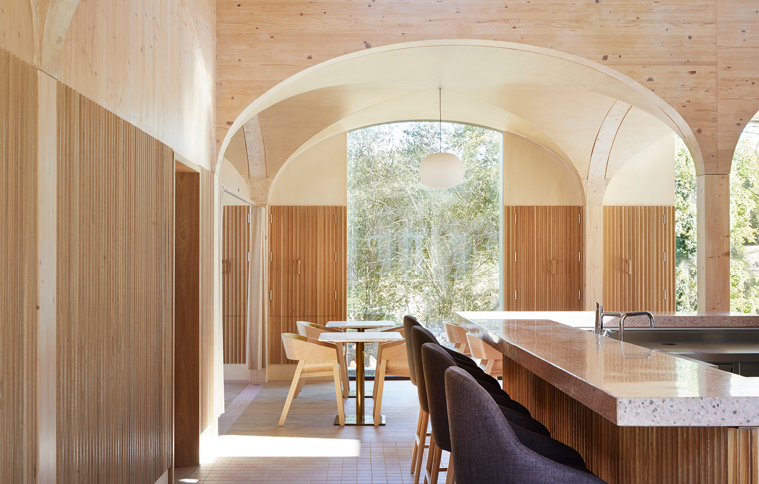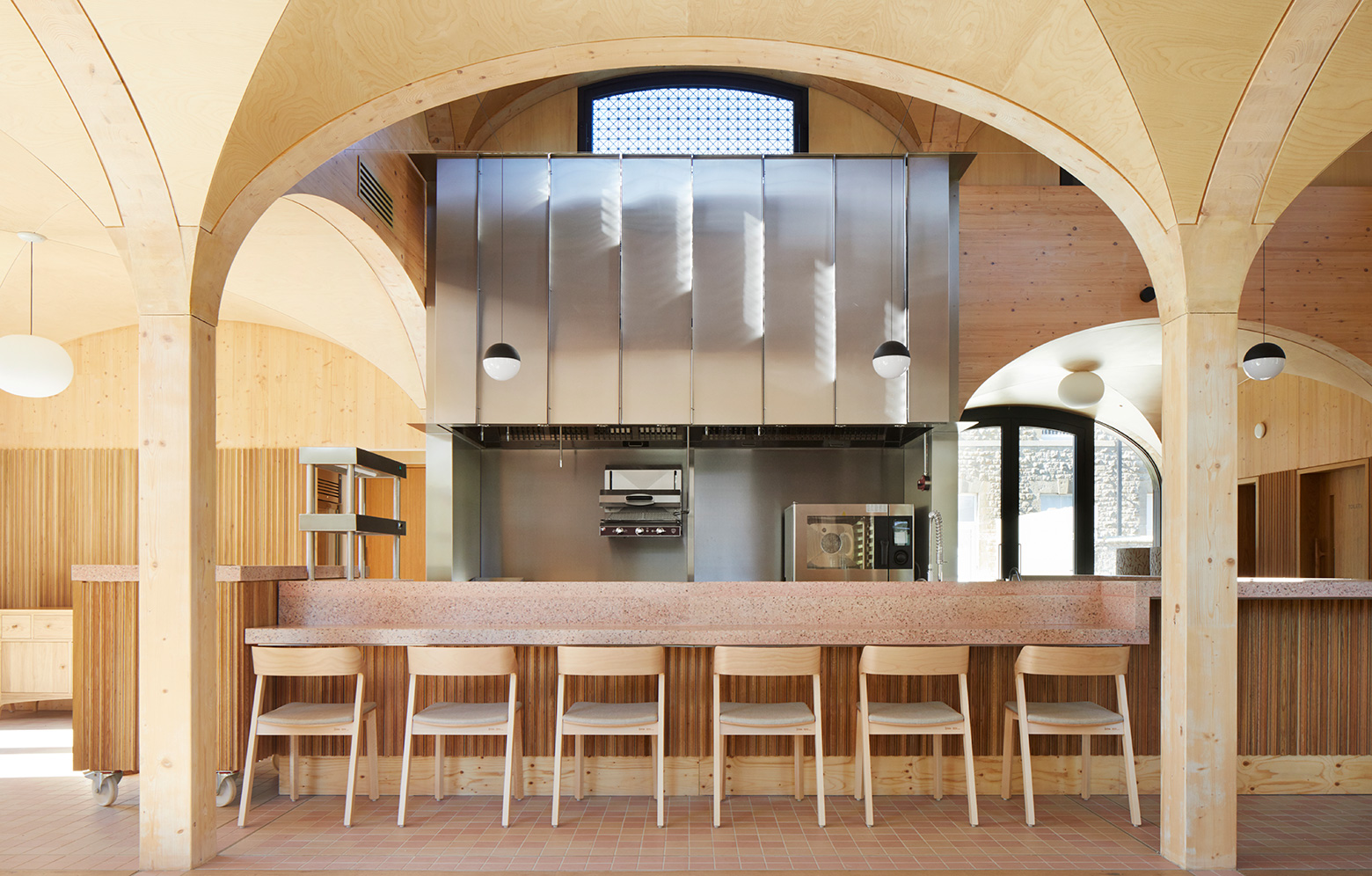 The restaurant is designed as a free-standing pavilion, clad in powder-coated aluminium and dark-painted wood. Despite its modern look, the exterior harmonises well with the older stone buildings nearby. The distinct vaulted arches are a key design element, but it is only when the visitor enters the building that they really make their presence felt. The exposed structure comprises repetitive arches measuring 4 x 4 metres that have been sawn from CLT elements. They are supported on columns of glulam, with plywood panels reinforcing the vaulting. The stained wood, granite worktops and metal pull together to create a light and harmonious interior.