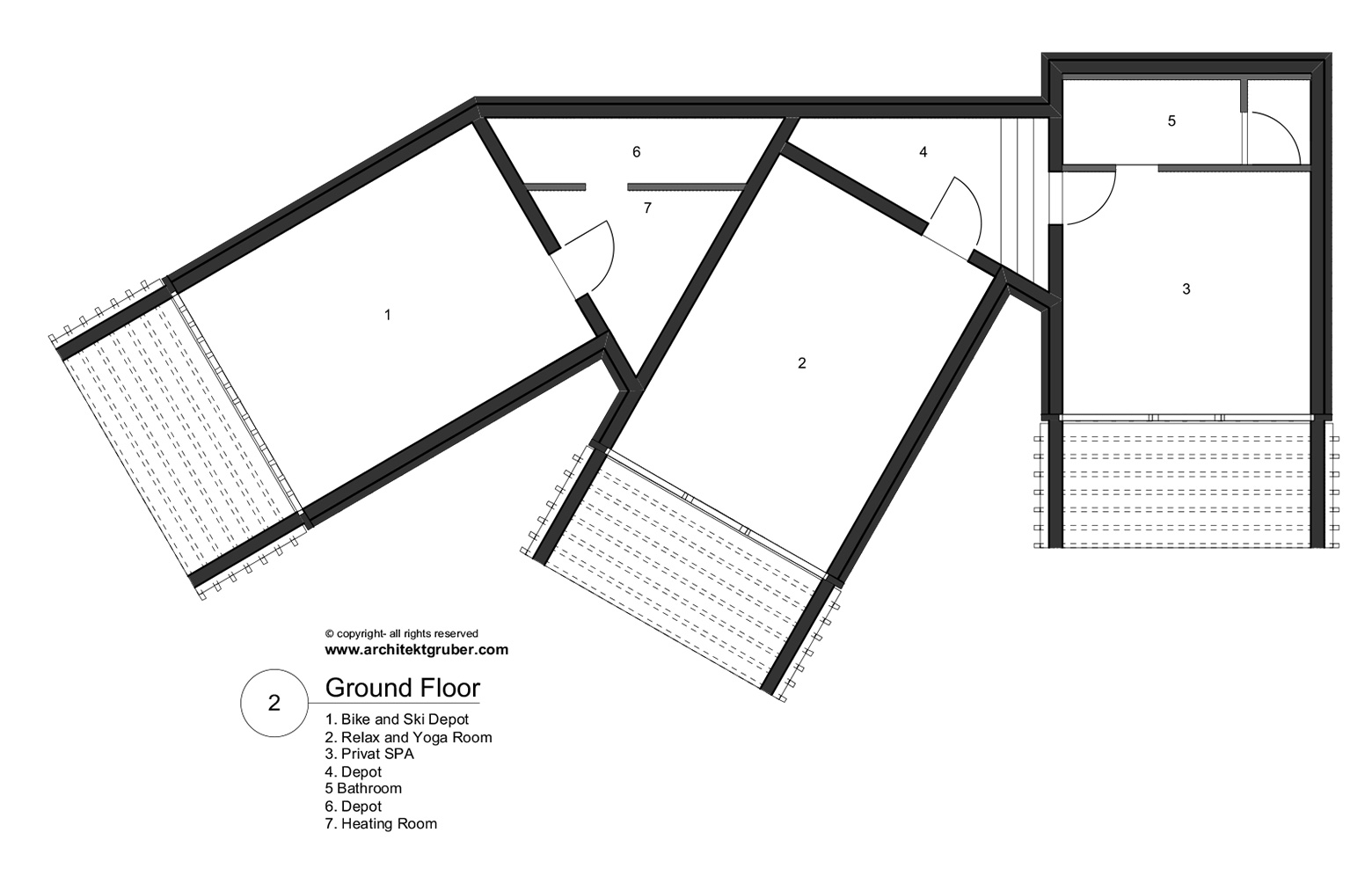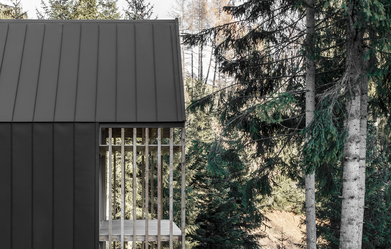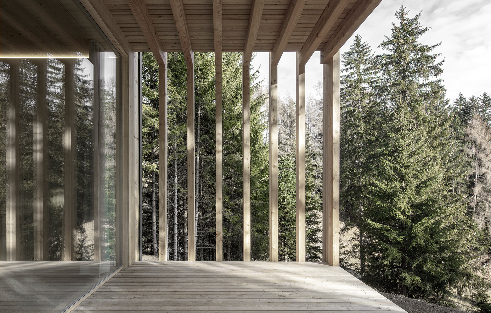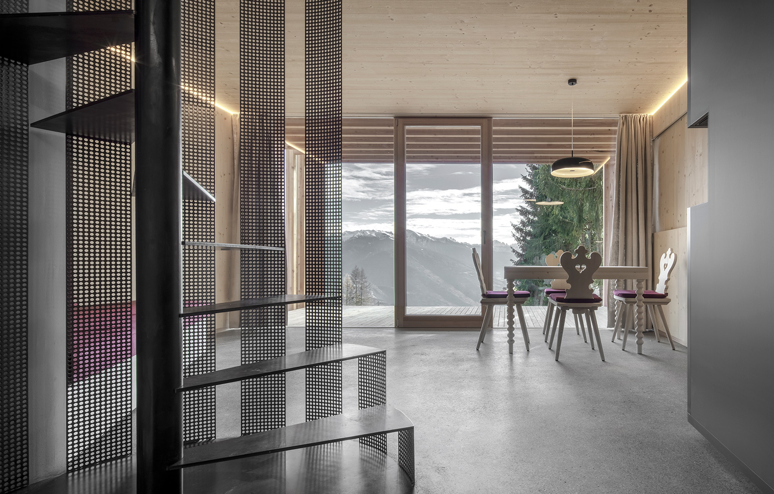 Do as little damage as possible and preserve as much as possible of the surroundings and the slope on which the cottages stand. This was Andreas Gruber’s philosophy in creating the three holiday cottages in South Tyrol, which attracts tourists from near and far, keen to enjoy the outdoor pursuits of the nearby Dolomites. The buildings are visually connected as a single unit, while still being independent and designed with small niches to give the guests privacy, even with the over-sized windows.