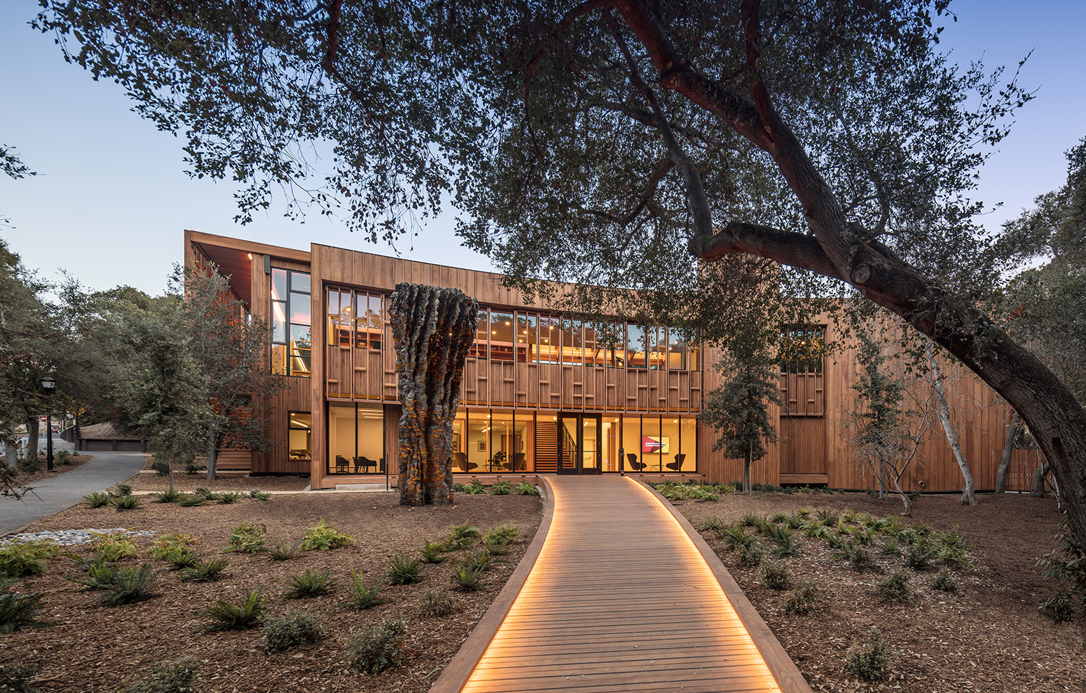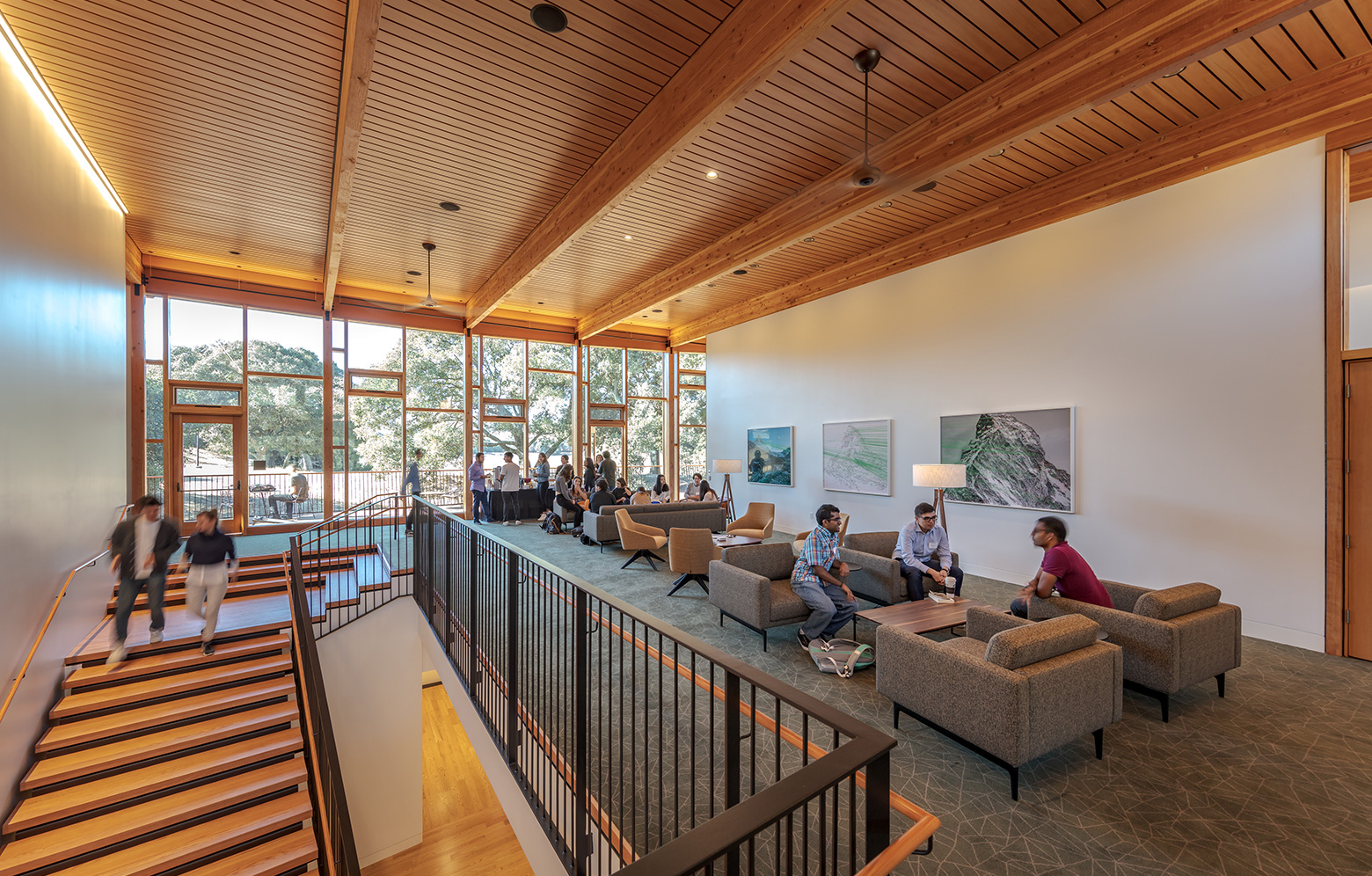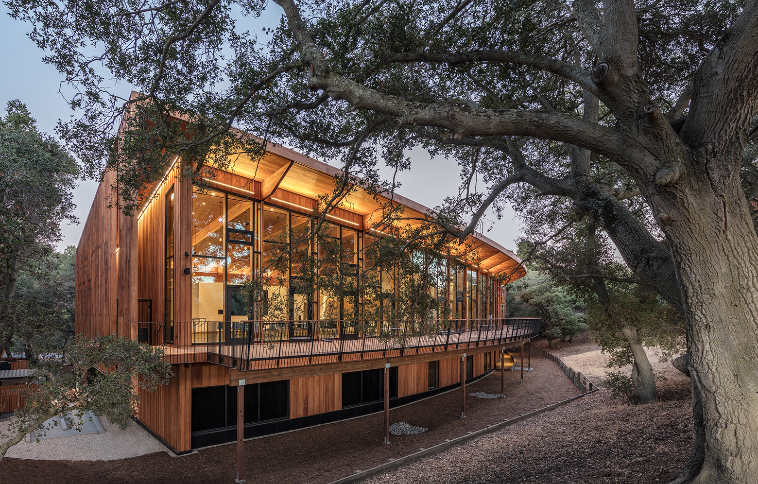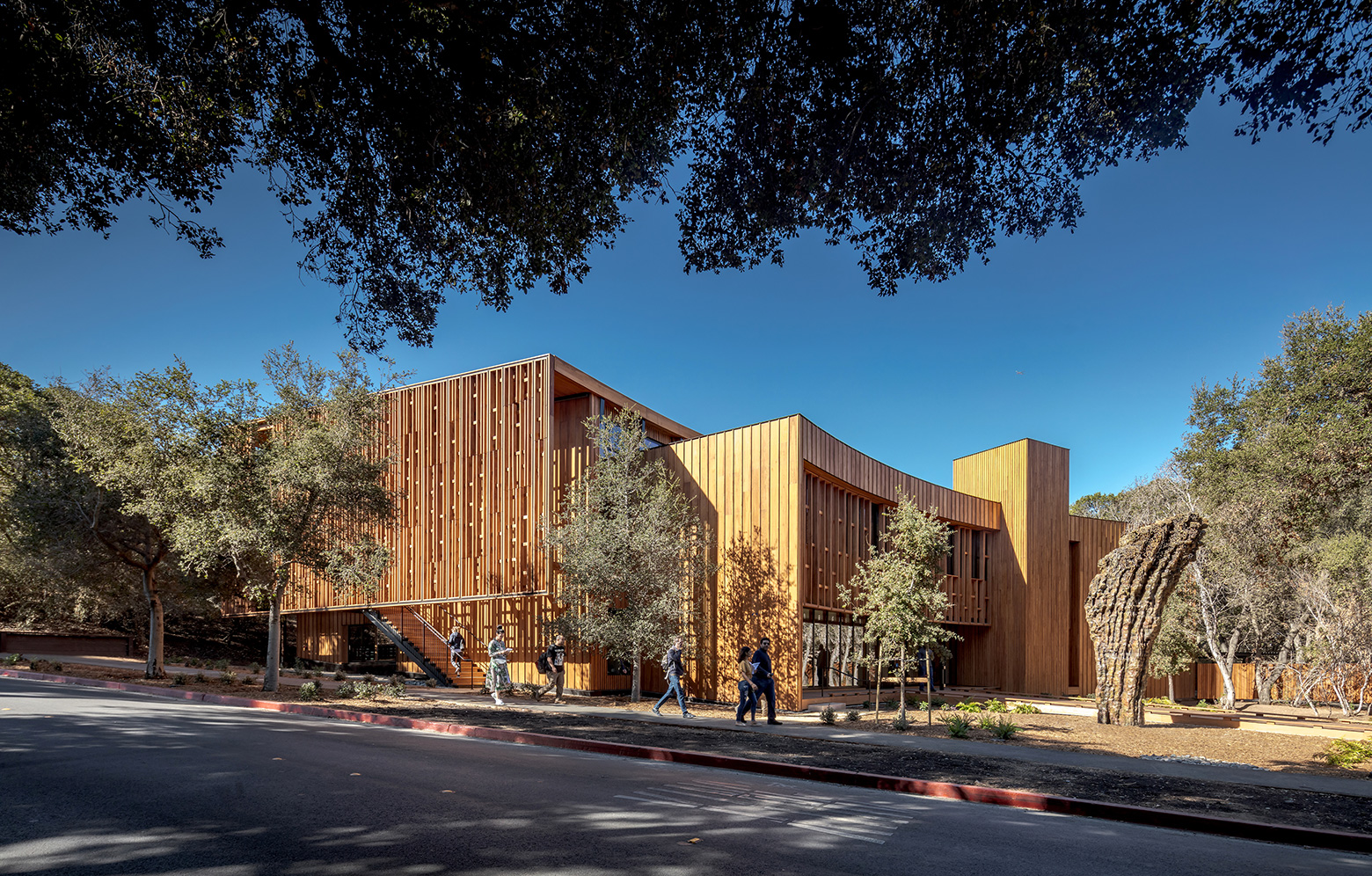 A former car park was identified as the perfect location for the new building that Stanford University has created for its students, sitting on a slope overlooking Lake Lagunita. The surrounding dense oak forest creates a sense of calm, far removed from the university’s busy campus life, and Ennead Architects have fully embraced this in creating the low-key building, with its long, sinuous boardwalk leading up to the entrance. From its position on the slope down to the lake, the upper floor offers magnificent views of the surroundings, taking in the water, forest and rocks. To make the most of this, the restaurant, classrooms and study areas have been placed on the upper level, while the administration and conference facilities enjoy the warm embrace of the ground level.