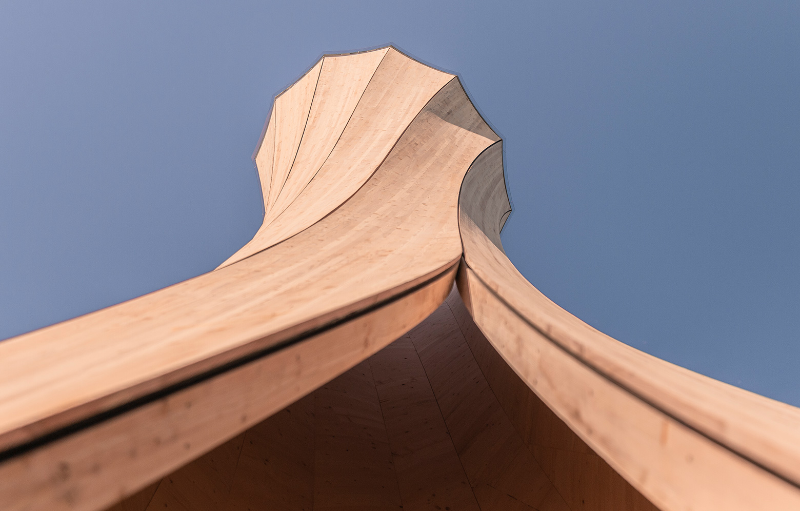 The process involves using the wood’s hygroscopic properties to shape it into the desired pattern. The 5 x 1.2 metre spruce CLT panels were produced as regular flat elements before the cross-lamination. The CLT panels comprise a specific layout of different parts that sees the individual laminates bend themselves to the designer’s will in the drying kiln. A computer simulator was developed to control the shaping of the wood elements during the process. After drying, the parts are glued together into curved and stable CLT elements.