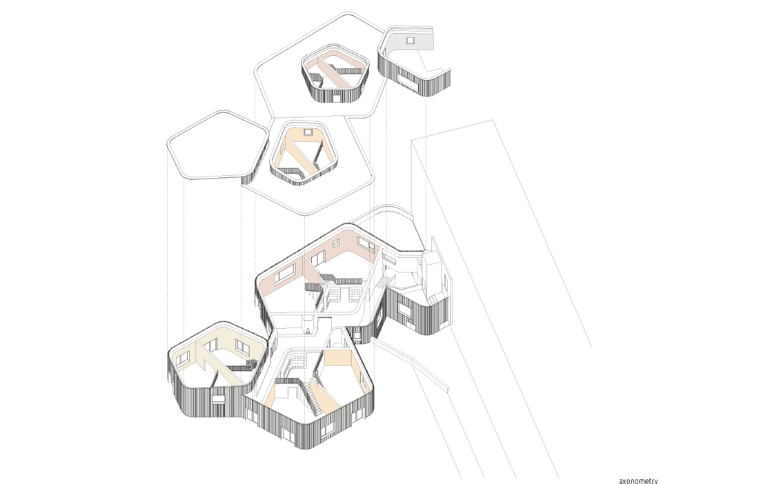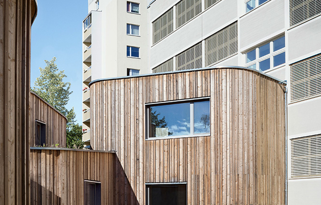 A contrast between a severe German school with a rendered façade on the one hand, and a soft and playful building on the other. This was the result when a recreational building was added to the site of the existing 1970s school. With soft lines, green, sloping roofs and a strict transition from roof to façade, the new building has an almost sculptural look. The façade is lined with larch cladding of varying sizes, which creates an interesting and vibrant pattern. The niches formed by the architects help to divide the schoolyard into several sections, with space for both play and relaxation.