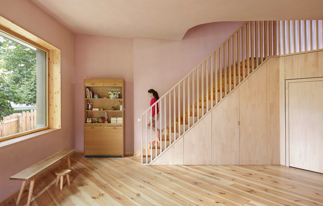 The interior comprises large rooms and places for activity in smaller groups, all finished in light colours. The exposed materials are mainly wood and clay, while the insulation is largely straw packed behind plasterboard. The design embraces the idea of using natural and recyclable materials, as this is an important part of the school’s ethos.