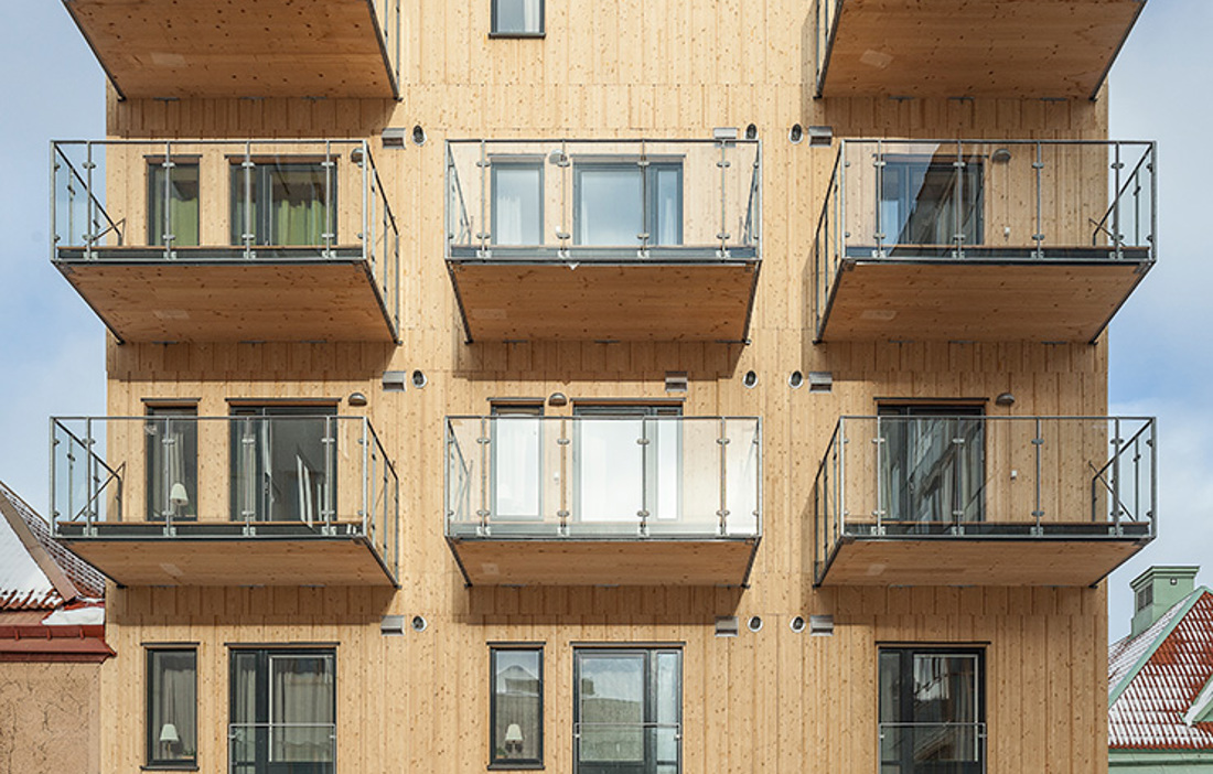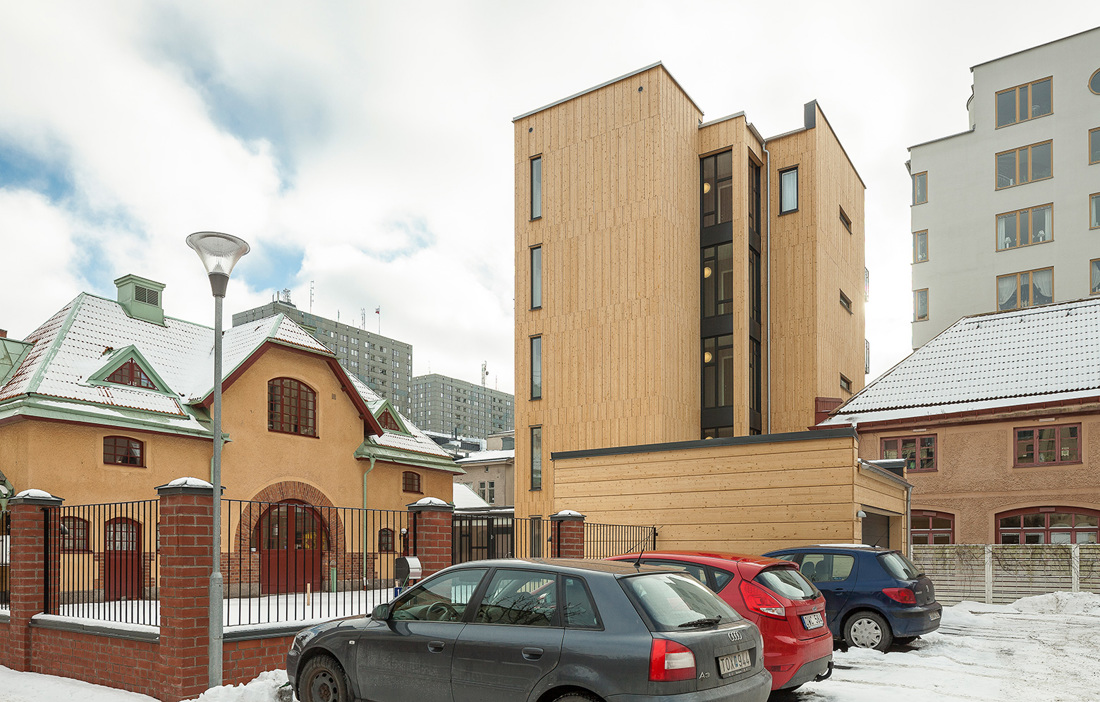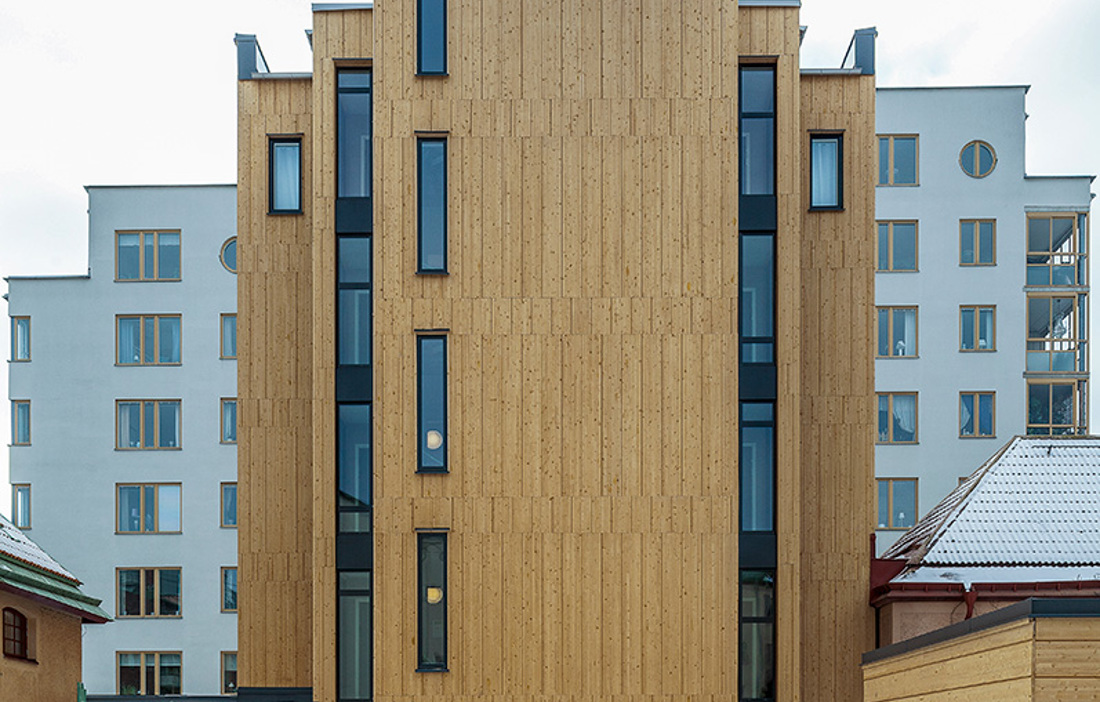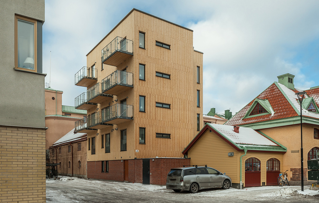 The five-storey apartment block is built around a glulam frame that is stabilised by a concrete stairwell. The façade comprises wood cladding that is placed horizontally, creating a fine contrast with the surrounding stuccoed buildings. On a site that was already surrounded by apartment blocks, there were further benefits to building in wood: the structural components were delivered on the day that they were lifted into place, for example, which made the construction process quieter and more efficient.