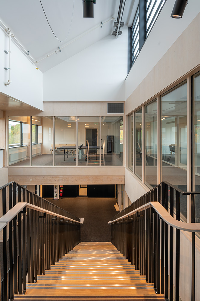 To retain the warm wooden feel, the installations are visible or encased in wood wool cement board, which was chosen for its materiality, but also because it has a good environmental profile. The interior of the entrance hall is complemented with birch plywood on the walls and ceiling. The stairwells are lined with coloured MDF panels for indoor use.