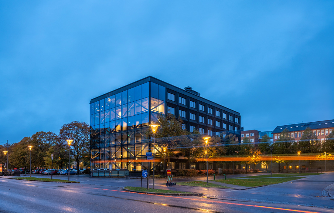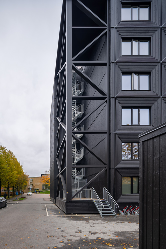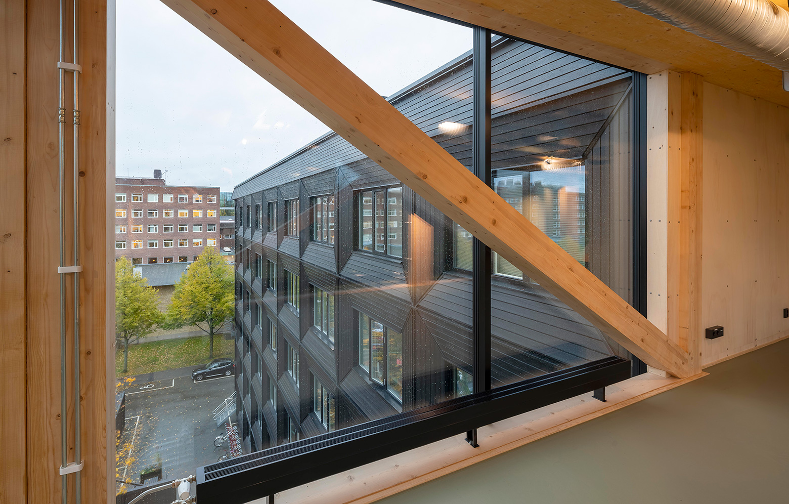 “The wooden façade creates an interesting three-dimensionality that accentuates the modular concept without making it banal. The faceting is repeated at ground level and in the eaves, terminating the design in a captivating way. The faceted façade and the glazed glulam trusses give the building two different scales that complement each other,” says Johan Olsson.