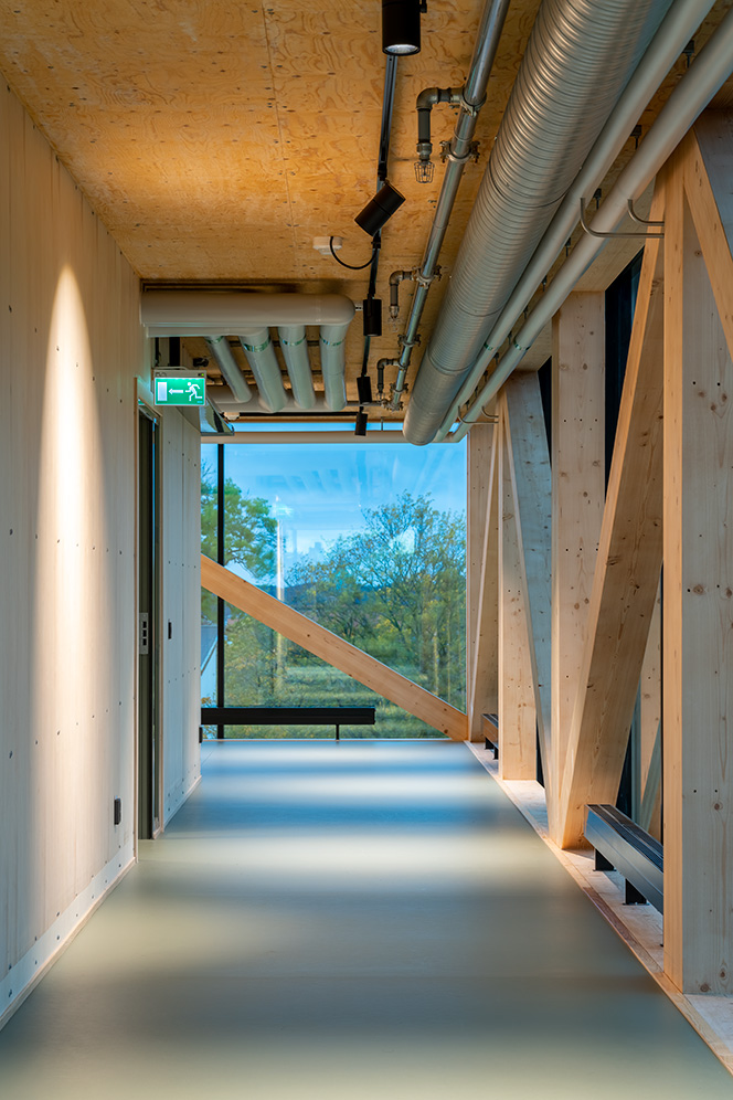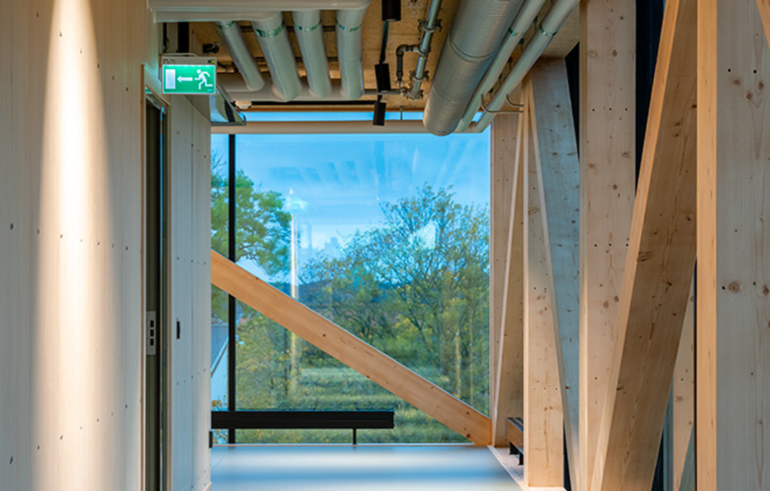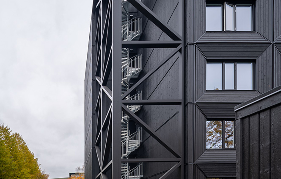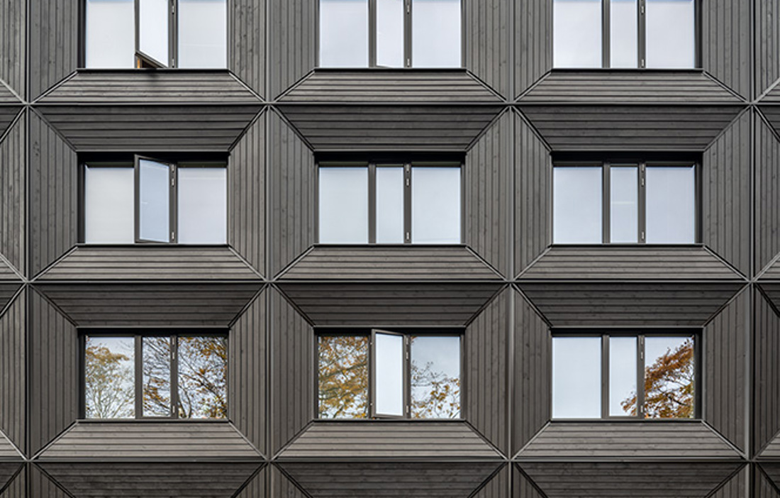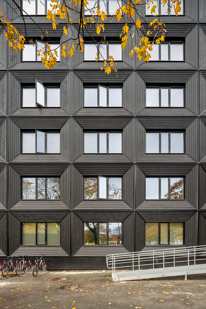 The building is a combination of industrially manufactured wooden box units, a glulam frame and a core of CLT around the elevator shaft and stairwell, which helps to improve stability. The wooden façades have a three-dimensional design.