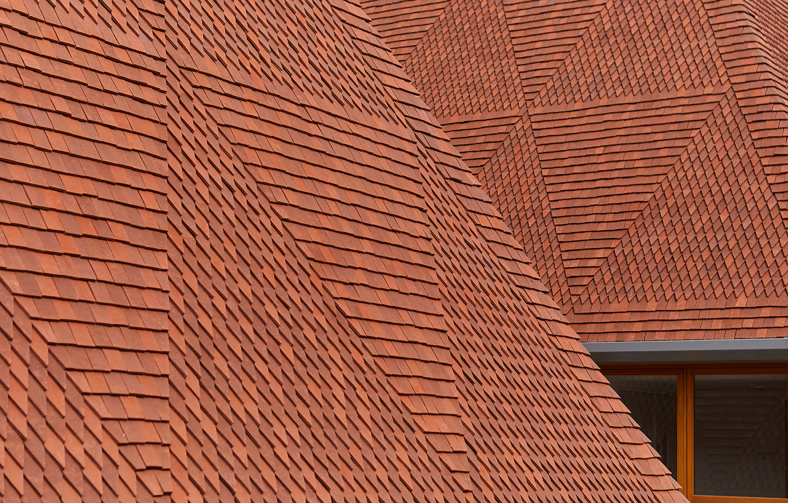 The L-shaped foyer, finished in brick and wood, also draws its daylight from rooflights, in the form of large, clear expanses of glazing partially framed by underlying wood beams. The practice rooms have windows running all the way around for maximum daylight. In contrast to the concert hall, the wood panels here are laid in an alternating pattern, where one triangle is solid and the next is perforated. The geometric shapes are also repeated externally, with the handmade clay tiles on the roof arranged in the same triangular pattern as in the interior. This connects the inside and outside to create a cohesive whole.