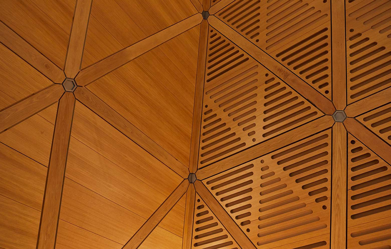The same type of geometric wood panelling is repeated in the upper parts of the walls and the lower parts part of the ceiling, but in two different designs and with differing functions. On the upper wall behind the stage, the panels have a smooth surface that helps to reflect and project the sound back out into the hall. The panels behind the audience, on the other hand, are perforated horizontally to damp the sound and prevent it from bouncing around.