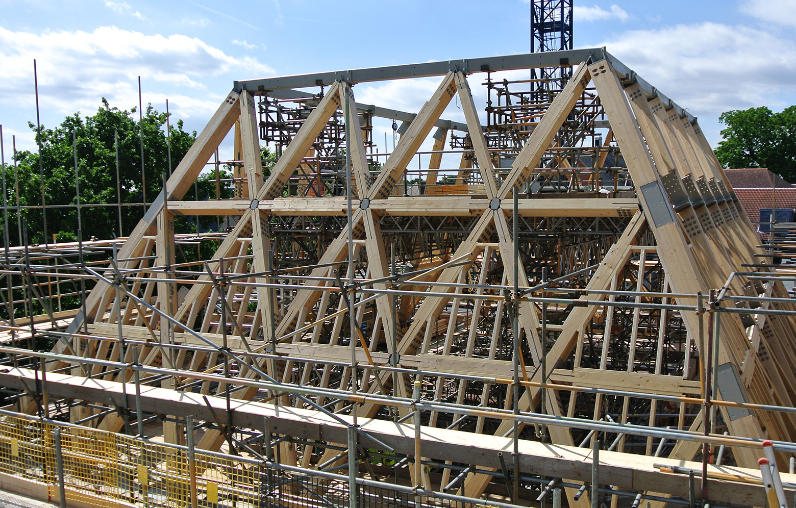 In terms of materials, the architects have chosen a combination of brick, wood and steel, with a roof structure in wood. The lower part of the walls is finished in handmade brick, over a structure of steel beams, with concrete in the basement level. The stunning ceiling is a triumph of slanted glulam with inset, exposed triangular panels in American white oak, which also contribute to the good acoustics. Steel nodes hold together the exposed glulam beams between the panels. The beams have a hybrid cross-section, with a core of spruce and an outer layer of American white oak. An upper compression ring and a lower tension ring combine with a system of steel wire ties to elegantly take up the horizontal forces in the roof structure.