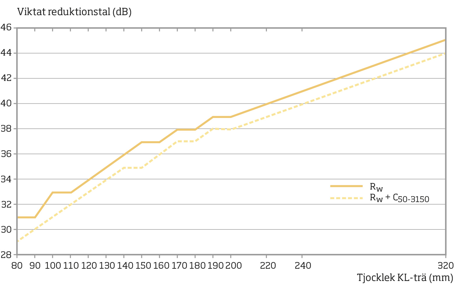 In Sweden and the wider Nordic region, we have learnt to build in wood without mixing in dense materials for the sake of sound insulation. While still fairly uncommon, it is a step in the right direction towards more eco-friendly construction. We have to understand, however, that wood does not work in the same way as concrete. Elements must be joined together in a way that ensures sufficiently good acoustics, stops the building from swaying or suffering settlement problems and guarantees fire safety. This requires a joined up approach, and monitoring at the construction site. The higher the buildings get, the more walls are needed to stabilise the building, and this creates extra transmission routes for sound. A CLT element (e.g. a wall) provides relatively poor sound insulation in the speech range (200–1000 hertz). This means that even quite a thick wall offers little in the way of sound insulation (see figure a).