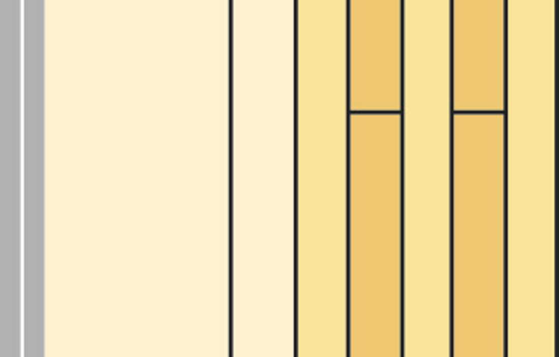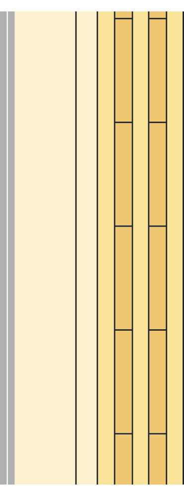 2. You can ‘build in’ nodes by adding layers to the wall asymmetrically. Adding an asymmetric layer to each side is good as it helps to avoid interacting resonances and ensures the wall’s sound insulating performance. Sound insulation class B can then be achieved both vertically and horizontally, while keeping the thickness of walls and floors at a reasonable level. The disadvantage is that you don’t have exposed wood in the apartments. It is, however, almost always possible to create this effect, for example in stairwells (if fire regulations allow).