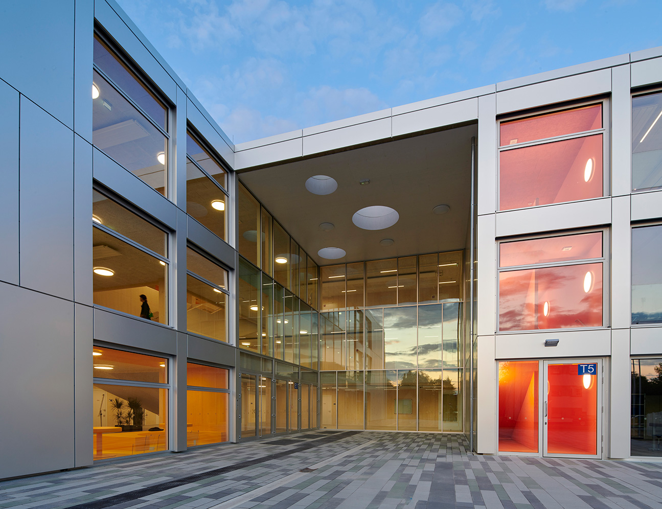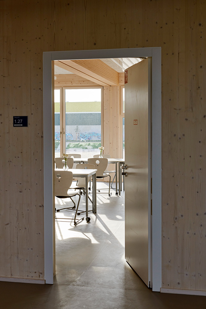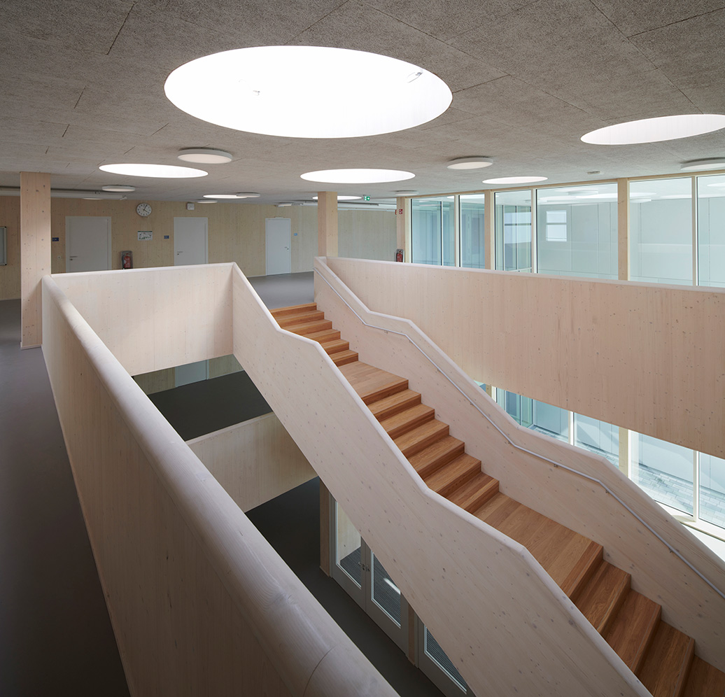 A school should have both a good learning environment and a certain amount of playfulness, in order to keep the students happy – creating well-being is important. This German middle school is a prime example of what that might look like. Externally, the students see a discreet building with a sheet-metal façade, but the large windows perhaps give a hint as to what lies beyond the entrance. CLT is the dominant material here, complemented by both birch cladding and OSB panels. The three-storey staircase has exposed CLT and leads to light, wide corridors that create airy spaces and less crowding during breaks. Leading off the corridors are small common rooms where the students can work independently or simply socialise, all painted in cheerful, bold colours, but thinly enough that the wood’s knots still show through.