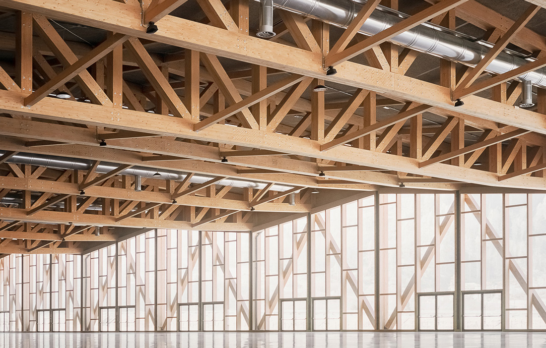 This in turn is made up of heavy-duty trusses that span over 50 metres, creating a completely open interior that is 100 metres long, with no posts to limit the building’s flexibility.