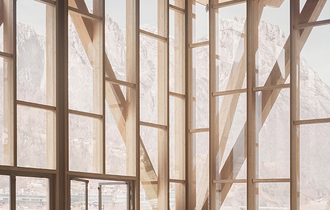 “The structural frame and the mountainous landscape of the Dolomites interact. Together they create a spatial continuity that draws the eye to the surrounding mountains, without lessening the building’s own impact.”