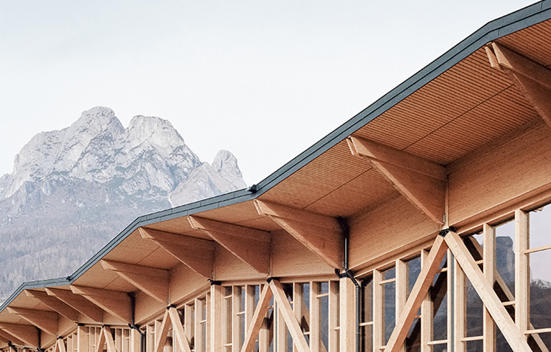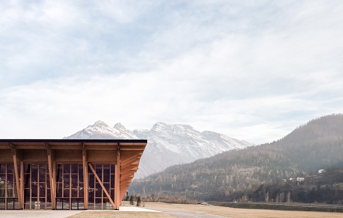 Visually, the recurring diagonal elements of the structure and the rhythm of the roof echo the jagged silhouette of the Dolomites. It is effortlessly light and airy, despite the impressive dimensions of the ventilation ducts and the glulam elements that support the roof and walls.