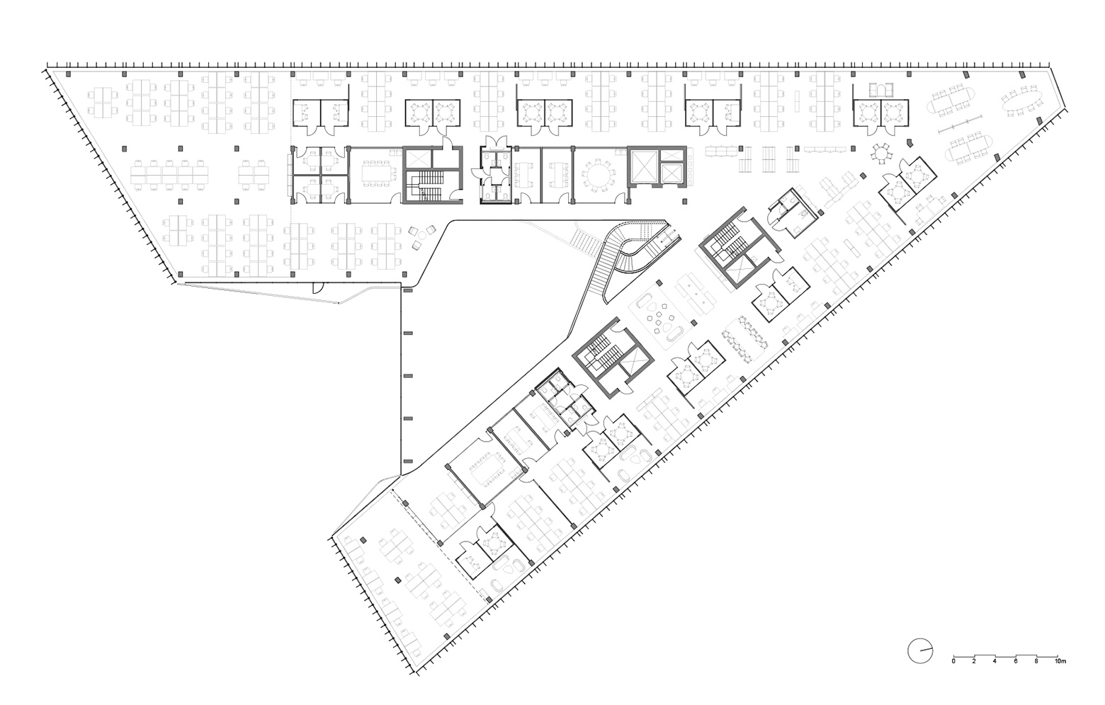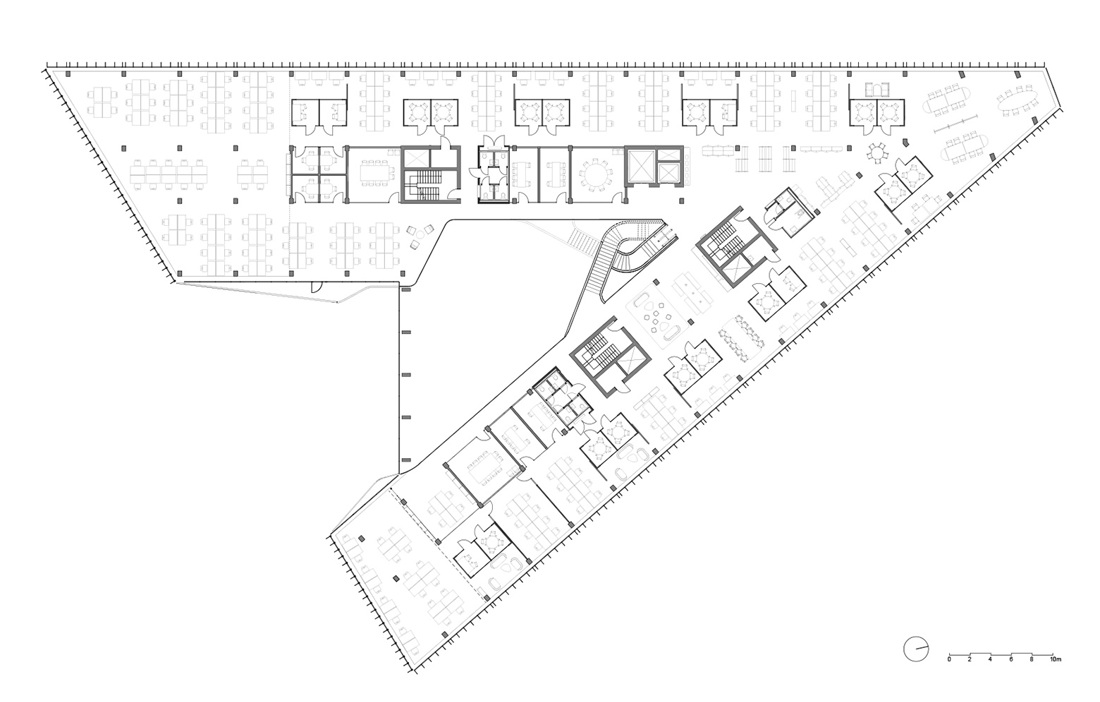 Finansparken is wedged into an almost triangular plot in the Bjergsted district, just north of central Stavanger. The plot formerly served as a car park and sits adjacent to the city’s traditional timber-framed residences. The wedge shape, both horizontally and vertically, has created a building that changes character and scale in its interaction with the surrounding cityscape. Helen & Hard entered into partnership with SAAHA, and the main concept was developed in close collaboration during the competition and preliminary planning phase. The division between façade (SAAHA) and interior (Helen & Hard) was only decided in the detailed development phase.