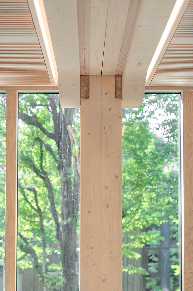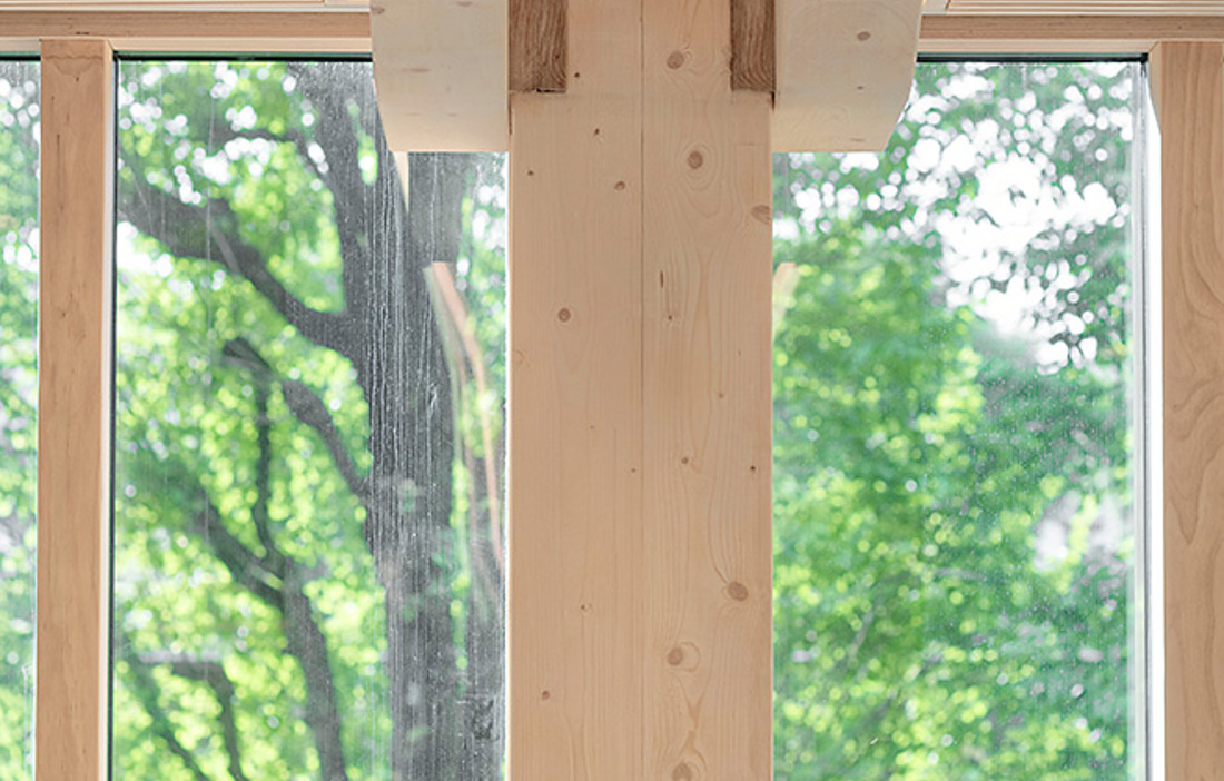 The entrance level has a double roof height, with fewer posts in order to create a sense of space. The posts and beams used in the first three floors are made of laminated veneer lumber (LVL) in the form of “Baubuche” from German company Pollmeier. They mainly delivered 40 millimetre beech veneer panels to Moelven Limtre, which glued and finished the material. Knot-free veneer has been used for the top layer on all exposed surfaces. The fact that beech is heavier and stronger gives the material high tensile, compression and bending strength, which enables more slender designs than would be possible with traditional spruce glulam. The ability to choose an extra high surface finish also makes Baubuche a good option for exposed structural elements.