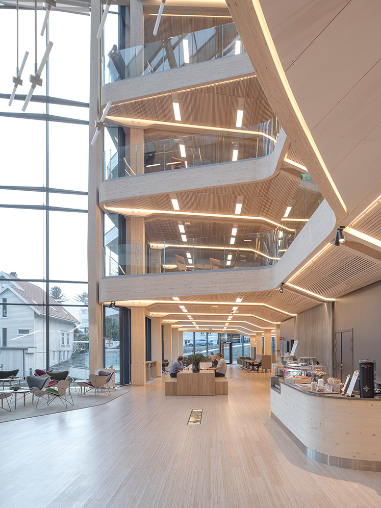 The complex wooden structure is precision crafted by Creation Hols and Hermann Blumer. It comprises a framework of prefabricated beams and posts in glulam, reinforced with LVL beams in beech veneer that were pre-assembled and then erected on site in Stavanger. Instead of steel fixings, the choice went to a special connection system using 80 millimetre-thick wooden plugs in beech hardwood. The design involves 3,500 beech plugs in total. CLT has been used in the floor system to stabilise the building through diaphragm action. Assembly was completed in sections rising vertically, with each section quickly fitted onto the next.