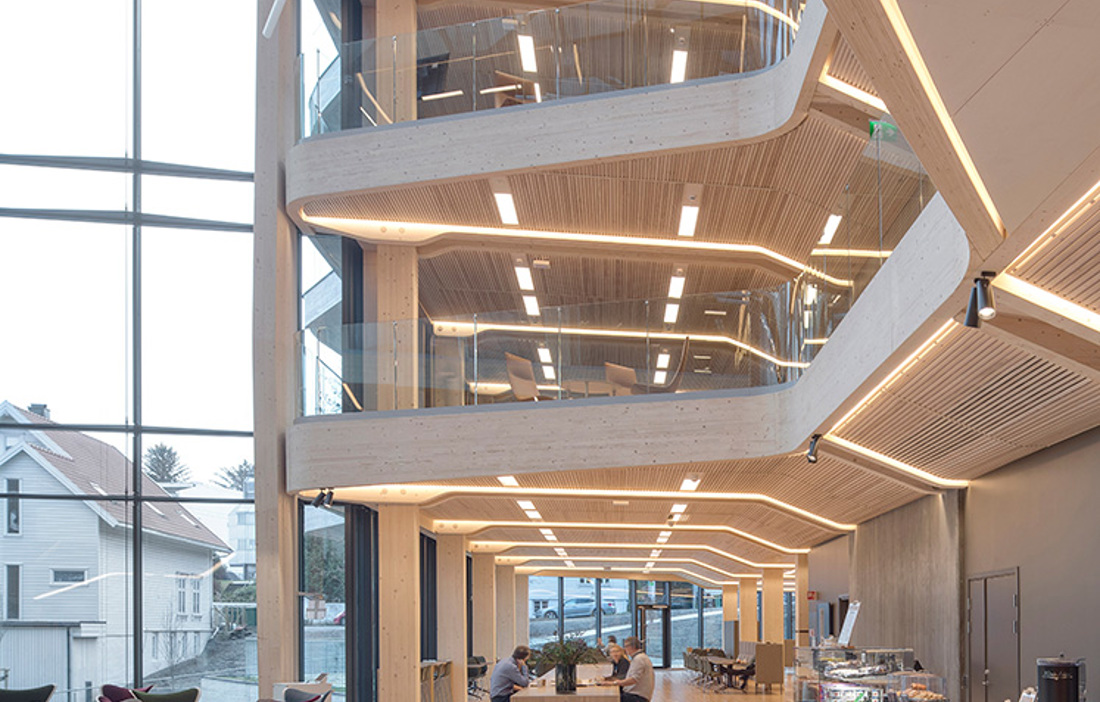 “Wood is a good environmental choice that feels modern and forward-looking, providing a good match with the bank’s values. We also wanted our new headquarters to blend in with Stavanger’s existing wooden buildings. What’s more, wood helps to create a warm, functional and pleasant environment where our customers and employees can meet and spend time,” comments Arne Austreid, CEO of Sparebank 1 SR-Bank.
