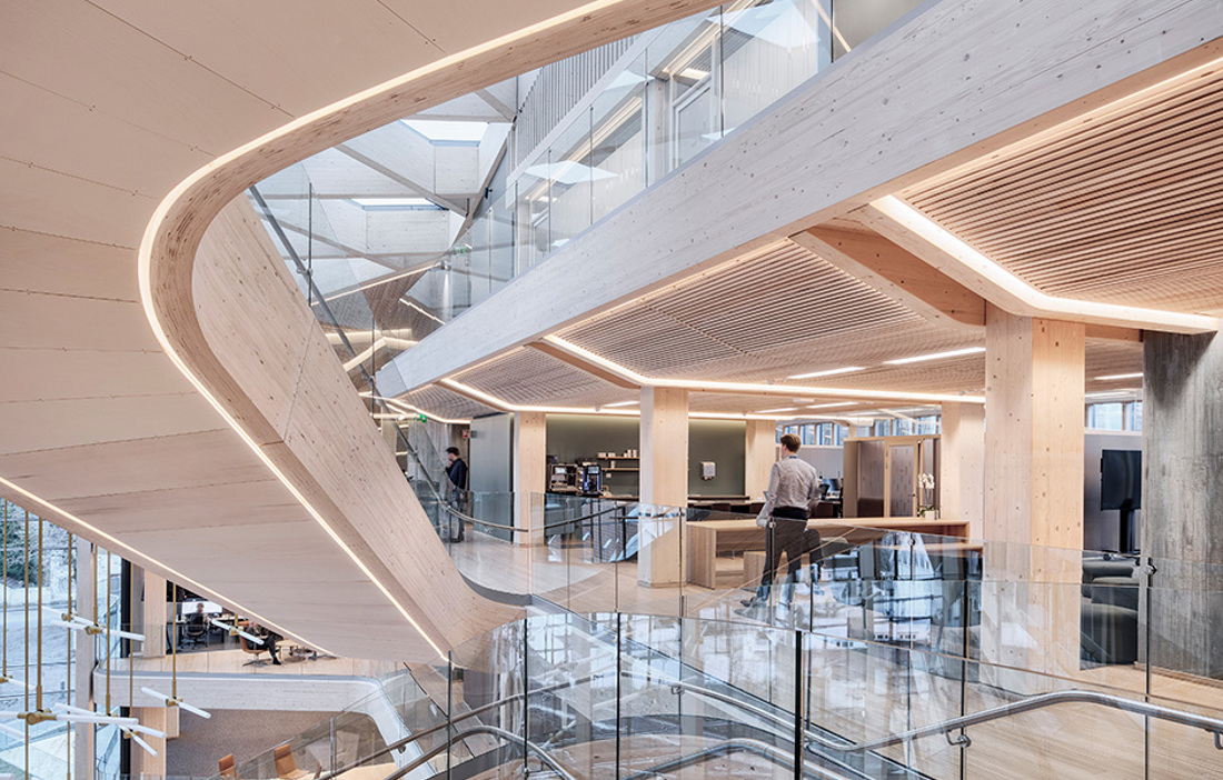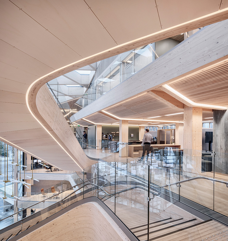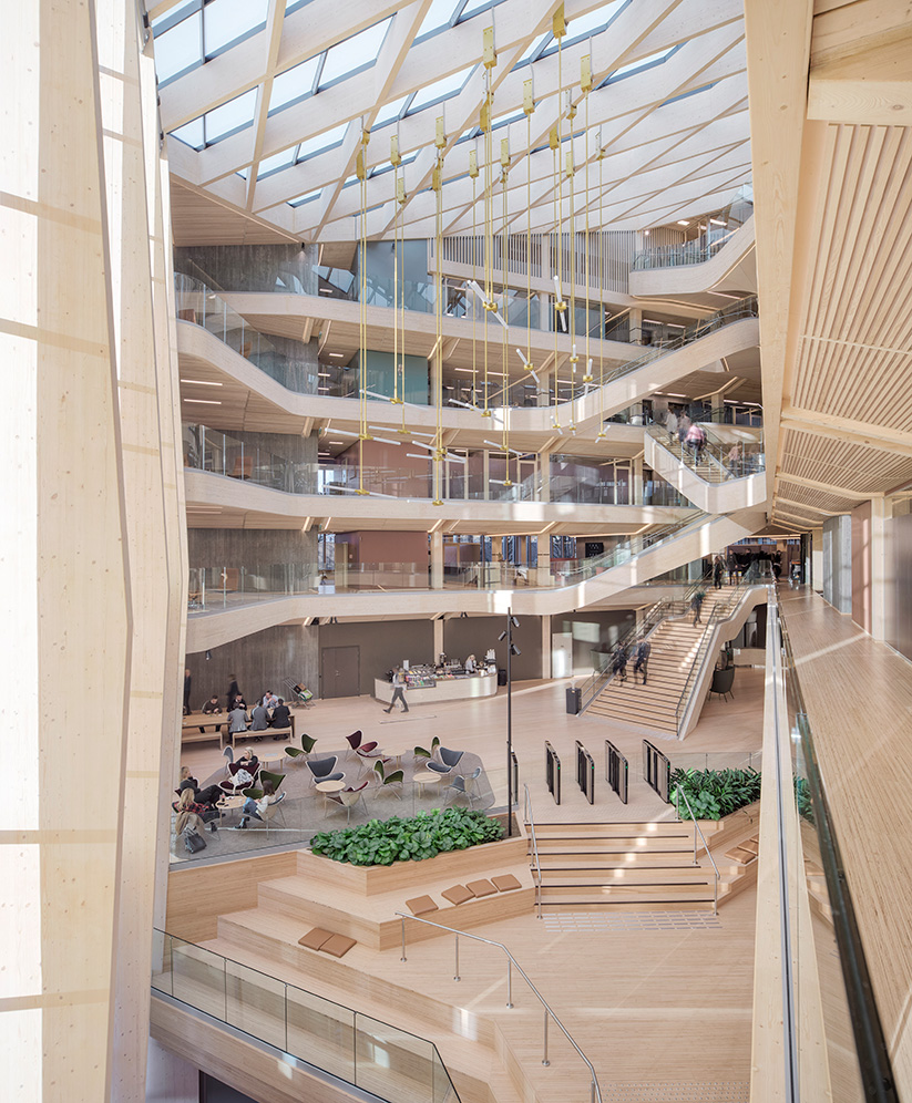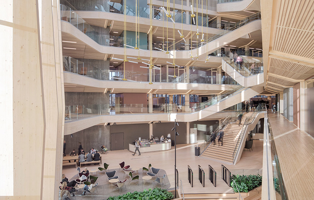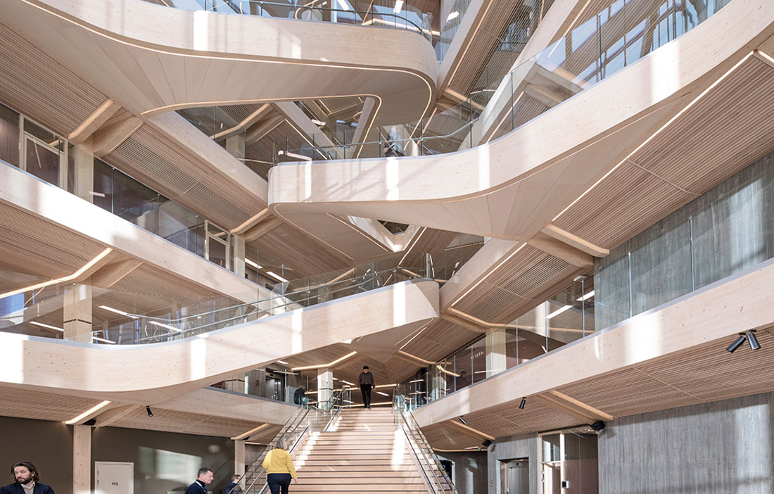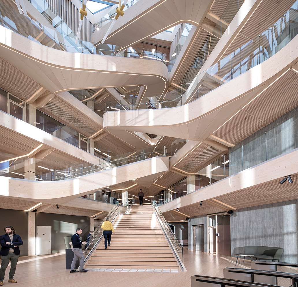 There is plenty to capture the eye in Finansparken, but perhaps the most striking feature is the sculptural staircase that punctuates the open atrium in the main entrance and winds on up through the building. The double-curved glulam beams were made by Hess Timber in Frankfurt, one of only a few companies capable of mastering the complex geometry.