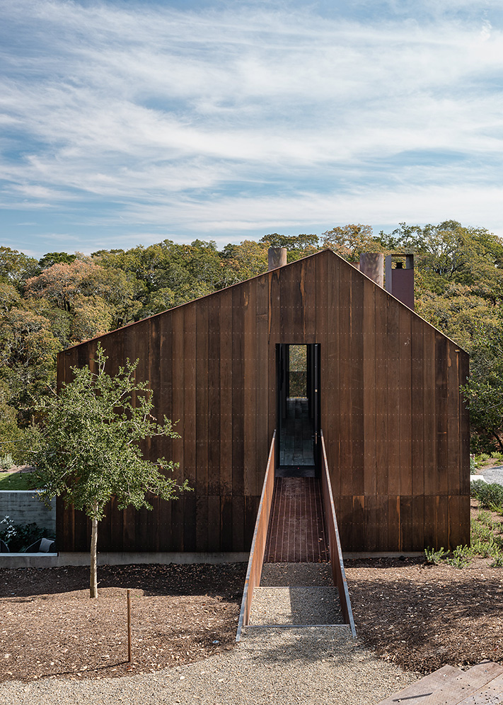 The façade is clad in recycled California redwood, with details picked out in materials including corten steel. The prominence of wood also continues inside, with California oak on the walls and floor.